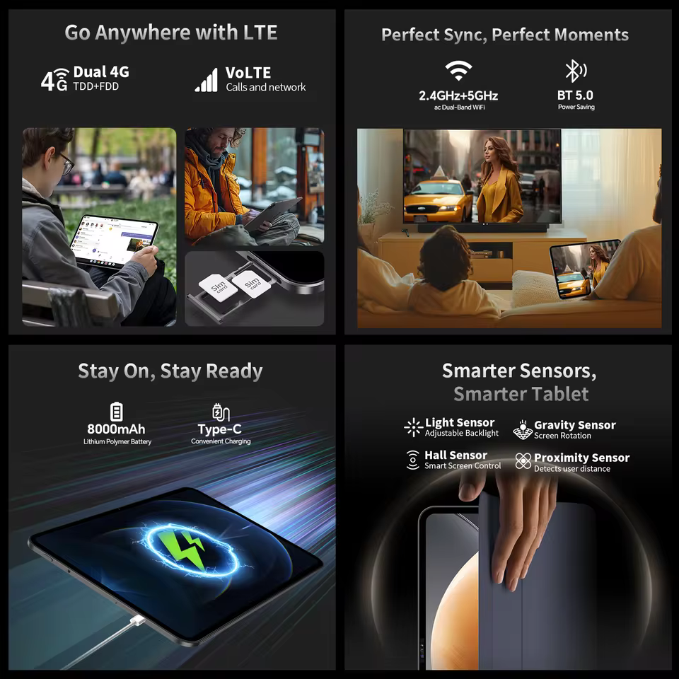 which is not only fast and modern, but also offers full Google Play support, so all your favorite apps are conveniently available. The 8000 mAh battery provides all-day battery life, so you don't have to constantly search for a charger. The Type-C connector, 3,5 mm jack, and 4G LTE connection and make use flexible and versatile, whether it's for home entertainment, online learning or work.