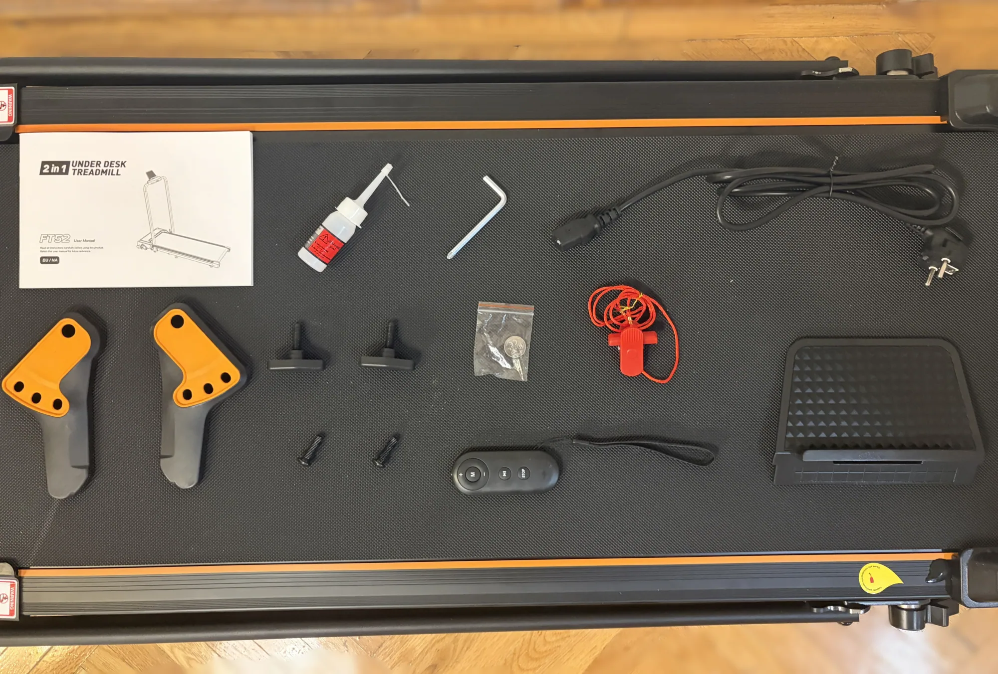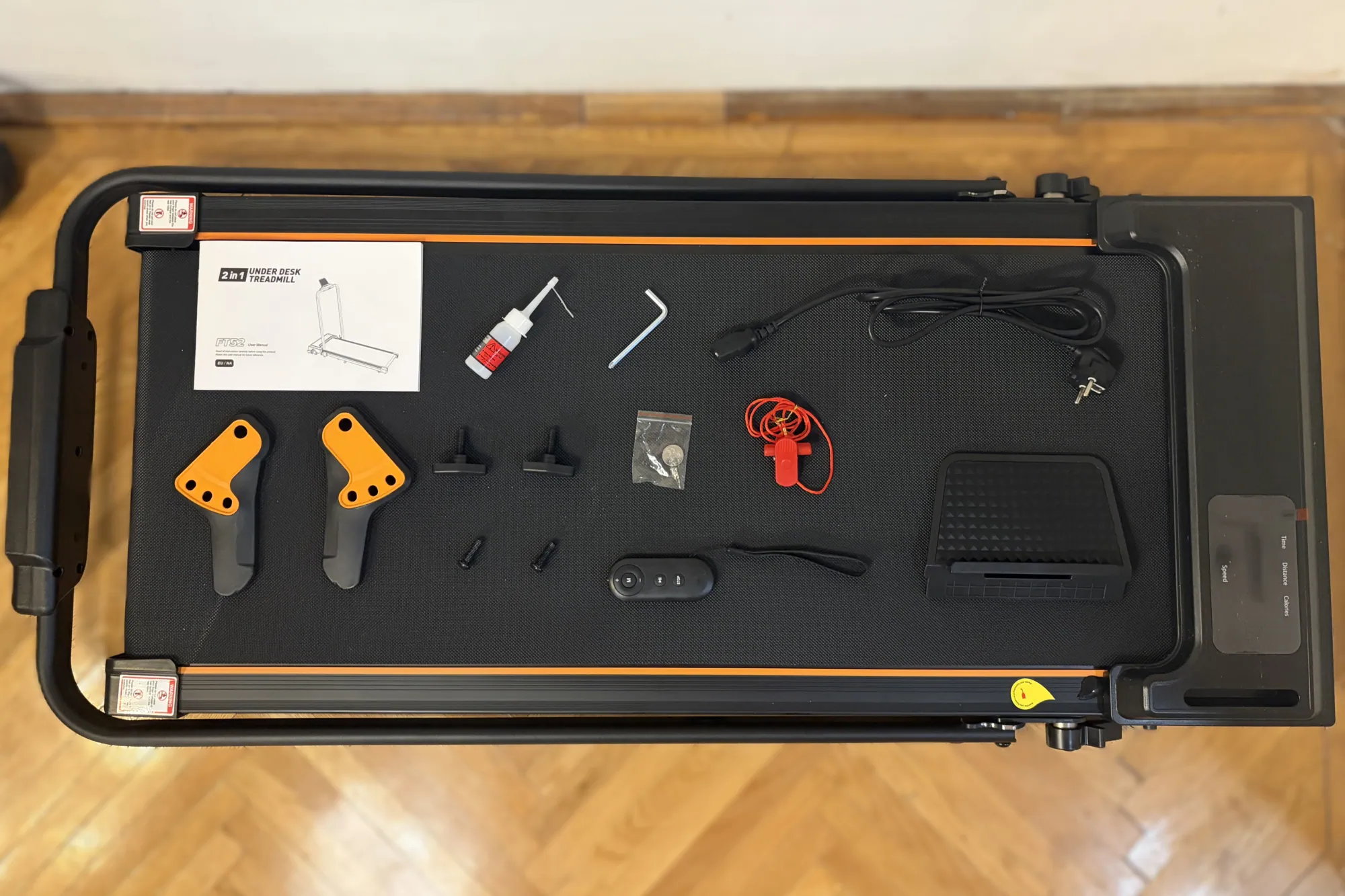 Only after that did I realize that the treadmill also came with a magnetic safety clip, a power cord, a manual, a remote control, some lubricating oil, an Allen key, a button battery, a few screws, and supports for adjusting the incline.