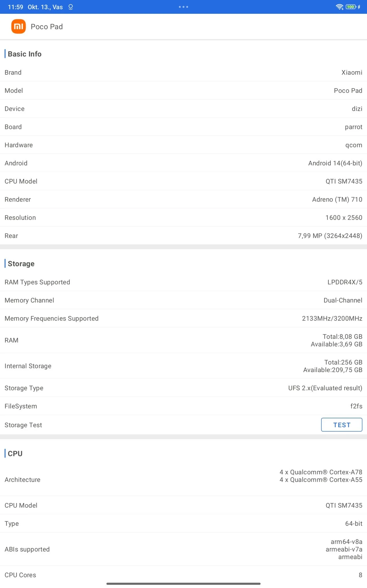 In addition, this is a fairly recent board, it is based on a 4 nm strip width, so the Xiaomi Poco Pad's operating time is not unnecessarily consumed by the higher performance.