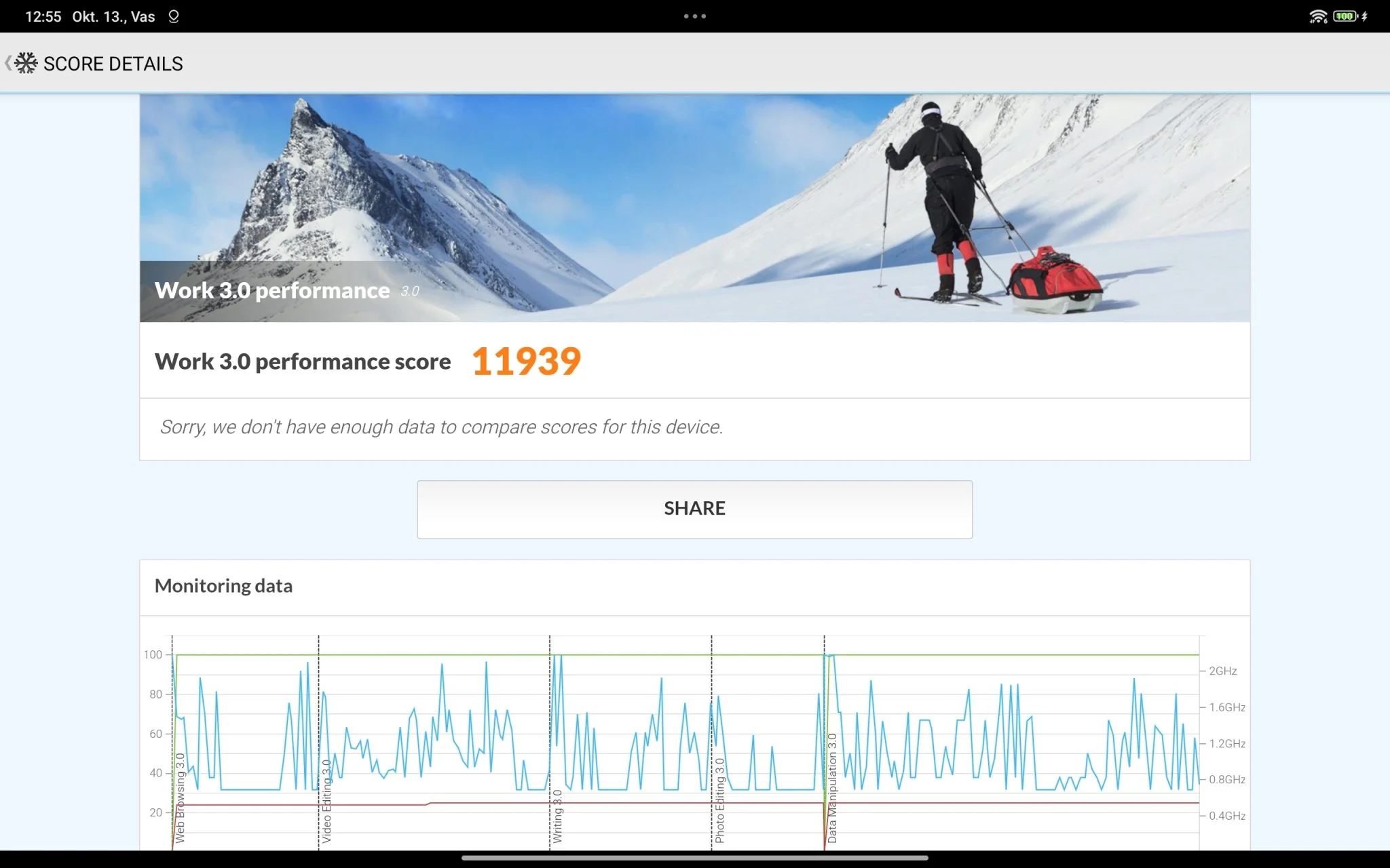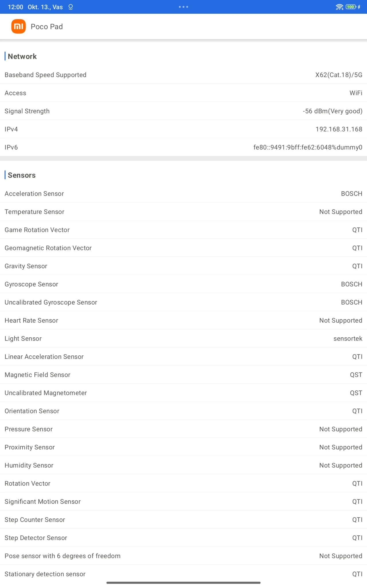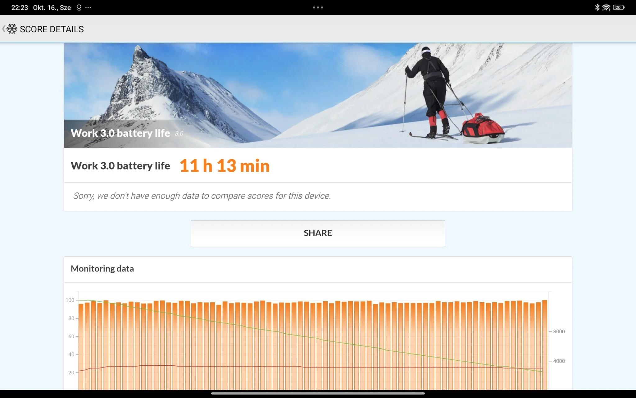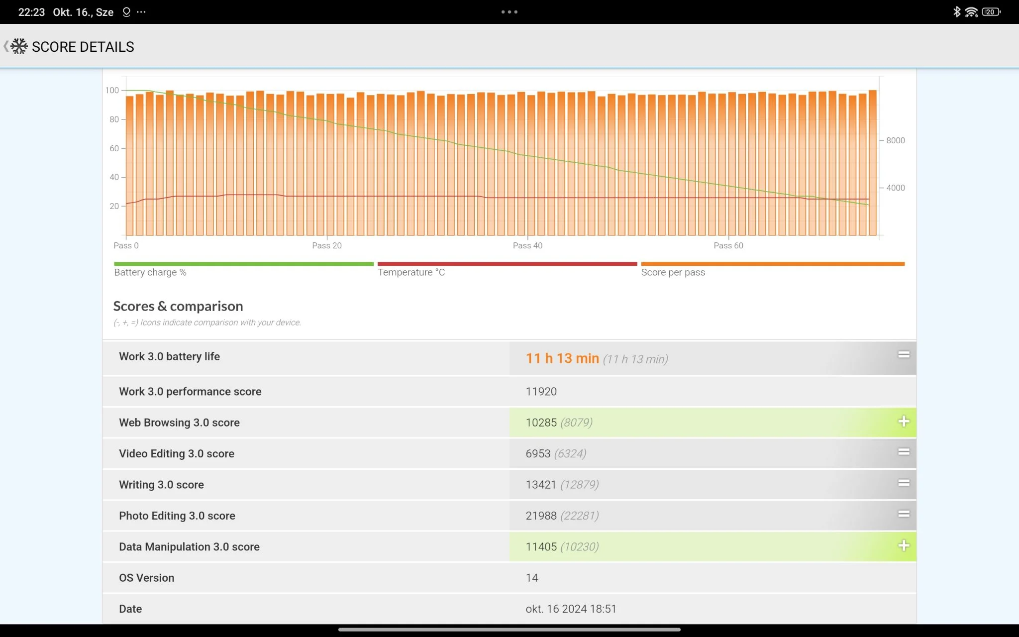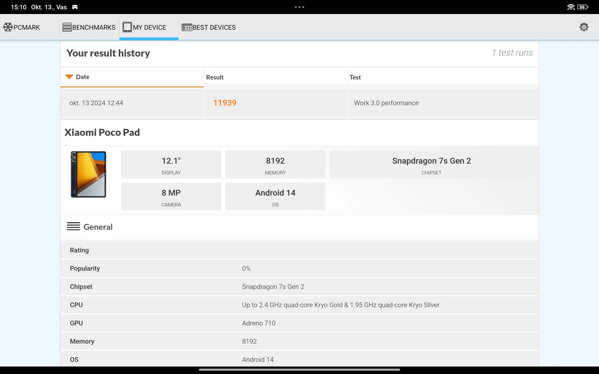 You could have already guessed from its charger that it is the Xiaomi Poco Pad capable of 33 W fast charging. This needs to be done 10 mAh battery besides, the 571-gram, 280×182,5×75 mm tablet has a huge 12,1-inch display, which must be properly fed with energy. The manufacturer claims that you can record videos for 16 hours and read for 18 hours from a battery of this size, whatever that means, but I think they meant spinning e-books. After watching a video for one hour, with WiFi usage, the machine lost 4% at medium brightness, I didn't get much different data when I played the same from the backup, the result was 3%. Measured with the Work 3.0, the dip from 100 to 20% took 11 hours and 13 minutes, plus the remainder, so operating time of 12,5-13 hours is probable.