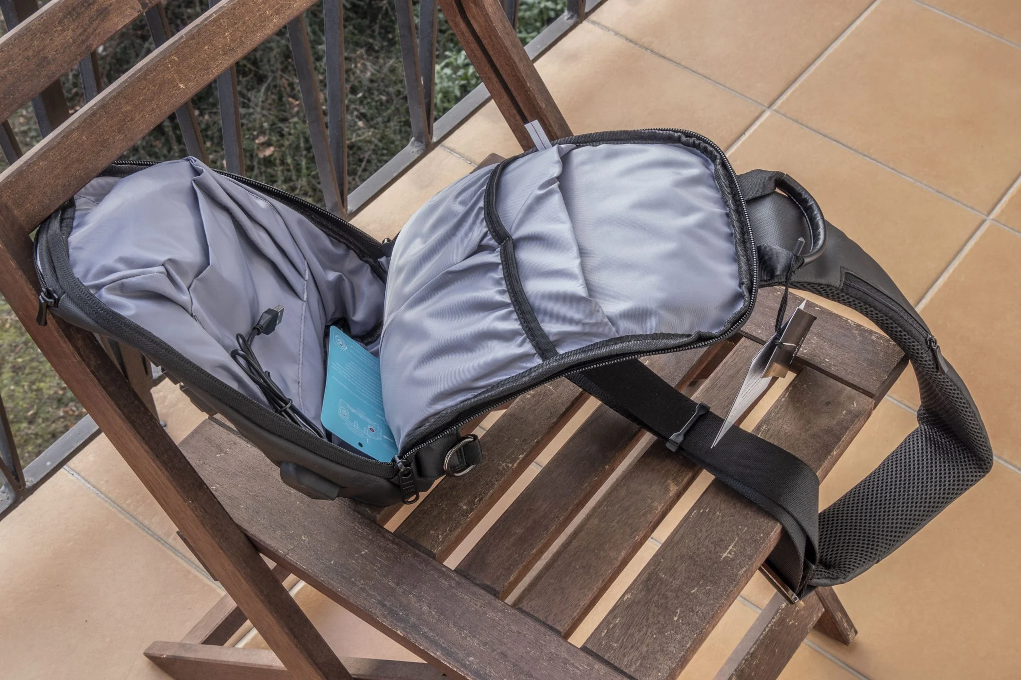 Even though I set the strap to the shortest length, even then I should have reached too far back for the zipper, also over my shoulder. Since I'm not exactly a flexible boy, it didn't go very well, I would have brought this forward if I were the designers. I still can't quite figure out where to put the USB output for two reasons: one, if I definitely want to charge one of my devices, I have to put a power bank in the bag anyway, and then why not plug the thing to be charged directly into it? One exception I can mention is if you need to answer the phone quickly and because of that I don't want to dig around in your bag to find it. The other is that these cables they can't even carry a lot of current, and this problem also exists with the Mark Ryden, I couldn't fast charge my phone with the built-in cable with the Yoobao H40. However, all the electrons still went in, but this is not the real thing.
