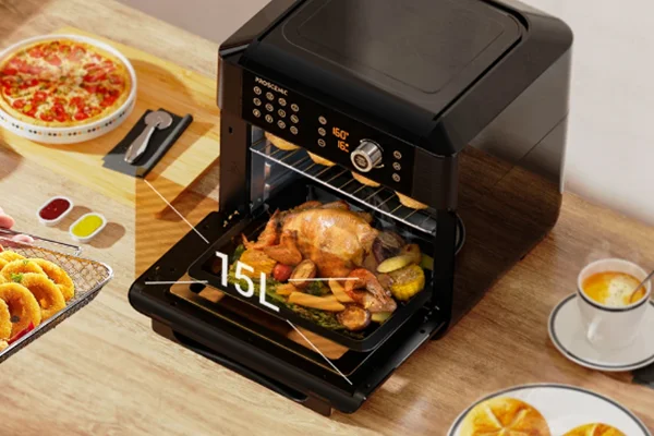 Prosecenic and Ultenic are one company, so they are quite experienced in the production of all kinds of kitchen appliances capable of baking. Since hot air fryers can have any format, the Proscenic T31 is most similar to a portable oven. Until now, did you think that 8 liter air fryers have a large capacity? Here, 15 liters are immediately available, that is we recommend it to those who want to grill chicken or barbecue, say, on the plot, and are not bothered by the larger physical size.