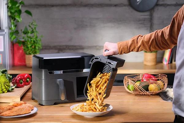 These can be symmetrical or asymmetrical. The asymmetrical ones follow the logic that the larger size usually contains the meat – for example, a smaller chicken – and the side dish, for example, french fries. Their capacity is usually around 8 liters or more. The best hot air fryers typically approach or in some cases even exceed this capacity.