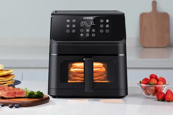 The special feature of the Cosori Premium II Plus air fryer is that it has a great viewing window at the front, so you can easily monitor the cooking process. It also has a shake function, so if you don't want to look, the machine will also signal you when it's time to turn the food. It operates very quietly, one of the quietest devices we've tried. The control is touchscreen, it has a bunch of predefined profiles, and since it doesn't have any knobs, it can be wiped clean with one movement. And its accessories are dishwasher safe, so this is one of the best air fryers on the market.