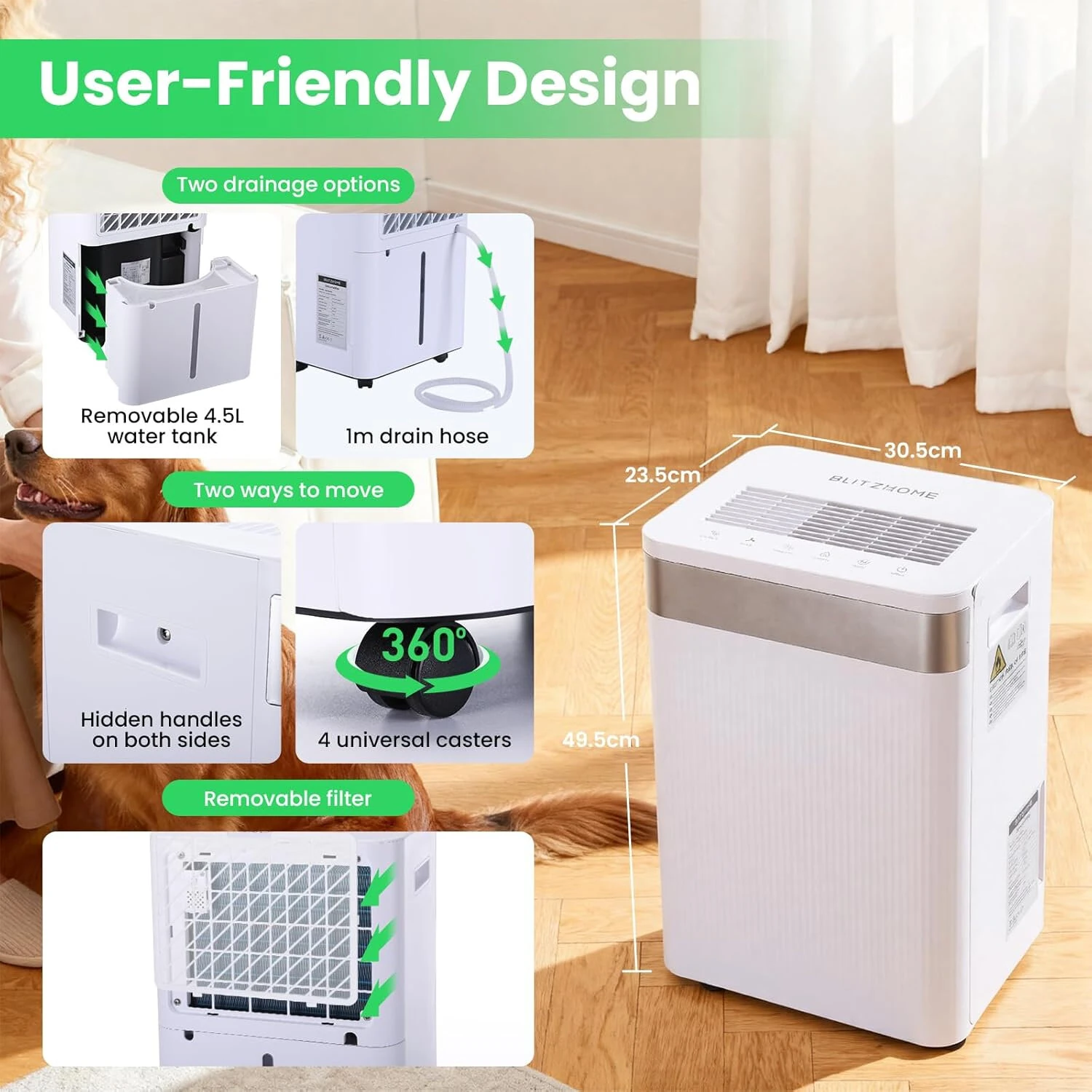 El moho no es decoración. El olor a humedad no es vintage. Y el aire húmedo no es bienestar, a menos que estés en un spa. Todo esto puede ser realmente perjudicial y es mejor solucionar el problema cuanto antes. Por suerte, el BlitzHome BG-D068K no se dedica a la jardinería ni a la idealización, simplemente hace el trabajo sucio: elimina lo que no debe estar en el aire. Veamos qué puede hacer este deshumidificador blanco y elegante, más inteligente, silencioso y duradero que la mayoría de sus predecesores.