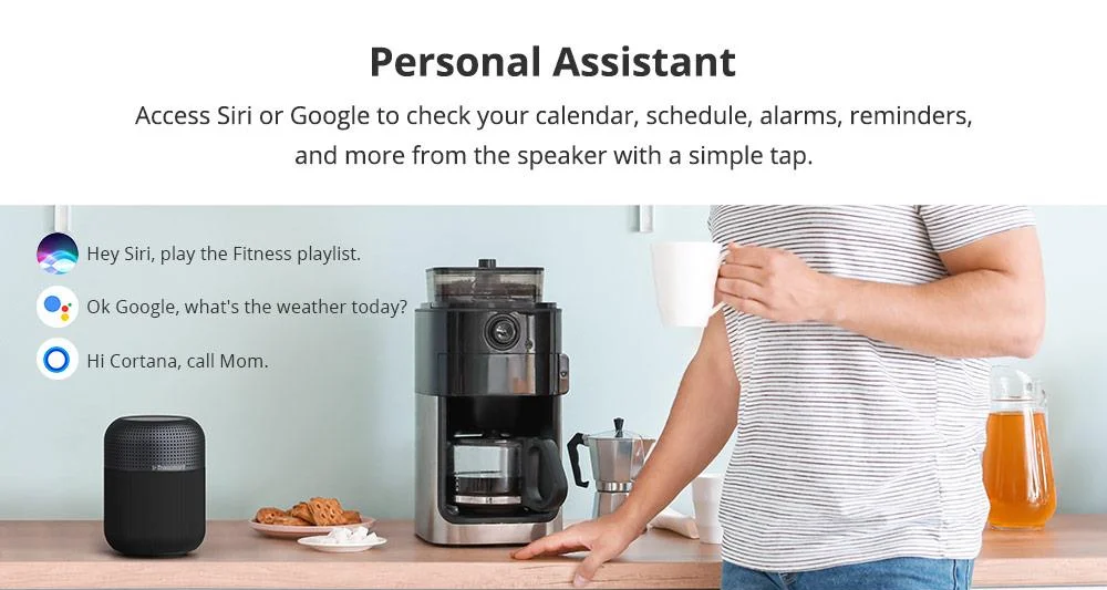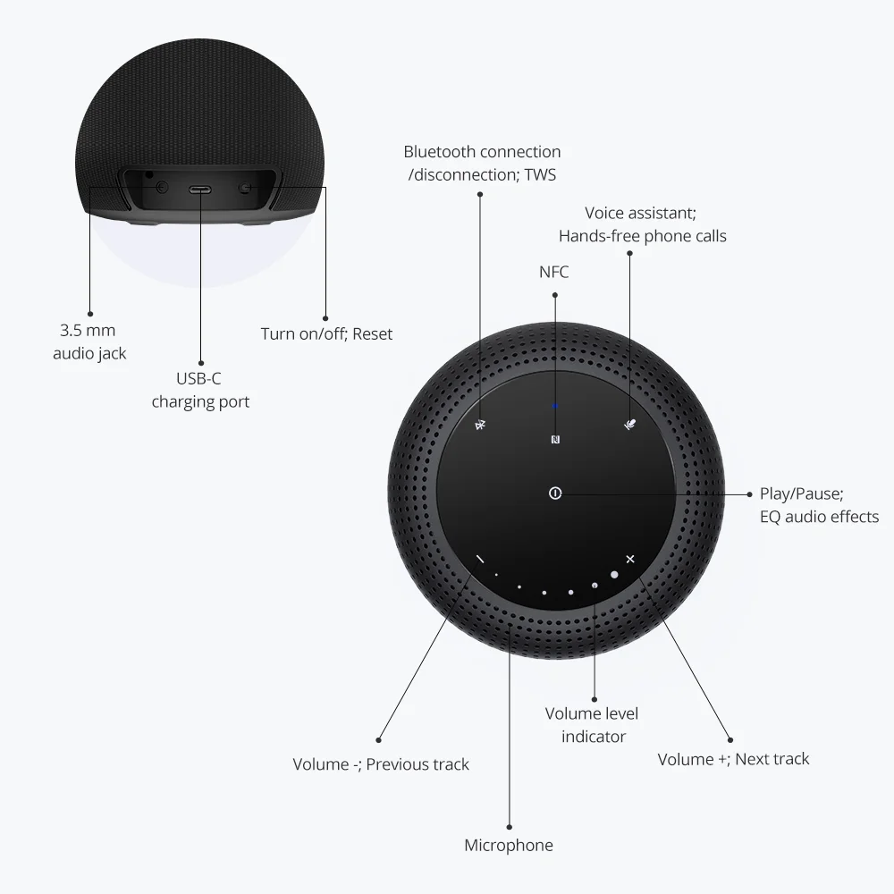 El diseño también merece una mención: marco de aleación de aluminio, cubierta de telaForma cilíndrica, limpia y no solo suena bien, sino que también se ve bien. El de arriba panel de control iluminado y sensible al tacto Funciona bien en la oscuridad y se puede activar con un solo toque. Siri o Asistente de Google, por ejemplo, si desea iniciar un temporizador o una entrada de calendario.