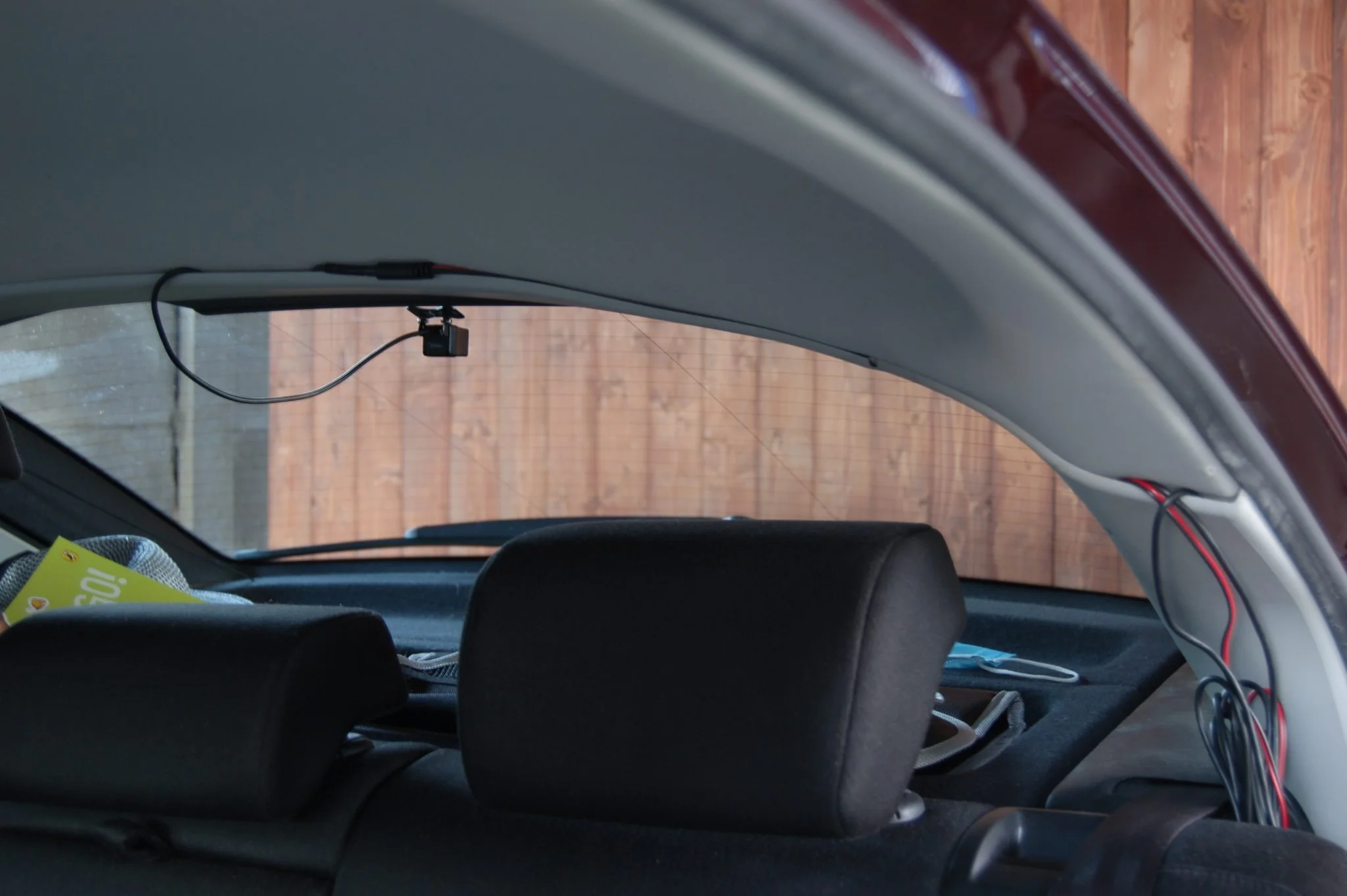 Las primeras experiencias fueron positivas, así que cableé el coche. El paquete contenía un pequeño "tensor" de plástico con el que pude meter las tripas de pollo debajo de la tapicería del coche sin dañarlas. Lo único que quedaba era el cable de la cámara trasera, con el que no podía hacer nada. En principio, al conectar la unidad trasera a la luz de marcha atrás, el espejo puede cambiar automáticamente a la imagen trasera al dar marcha atrás, pero no quiero usar esta función, así que cortaré el cable innecesario o permanecerá conectado. . Según el vídeo de instalación de fábrica, la cámara trasera está destinada al exterior, encima de la matrícula, e incluso hay un vídeo de demostración con un bonito SUV Audi azul, pero creo que no escuchan. Como parece que el especialista atornilla el equipo en el pozo, no creo que hayan perforado el coche.
