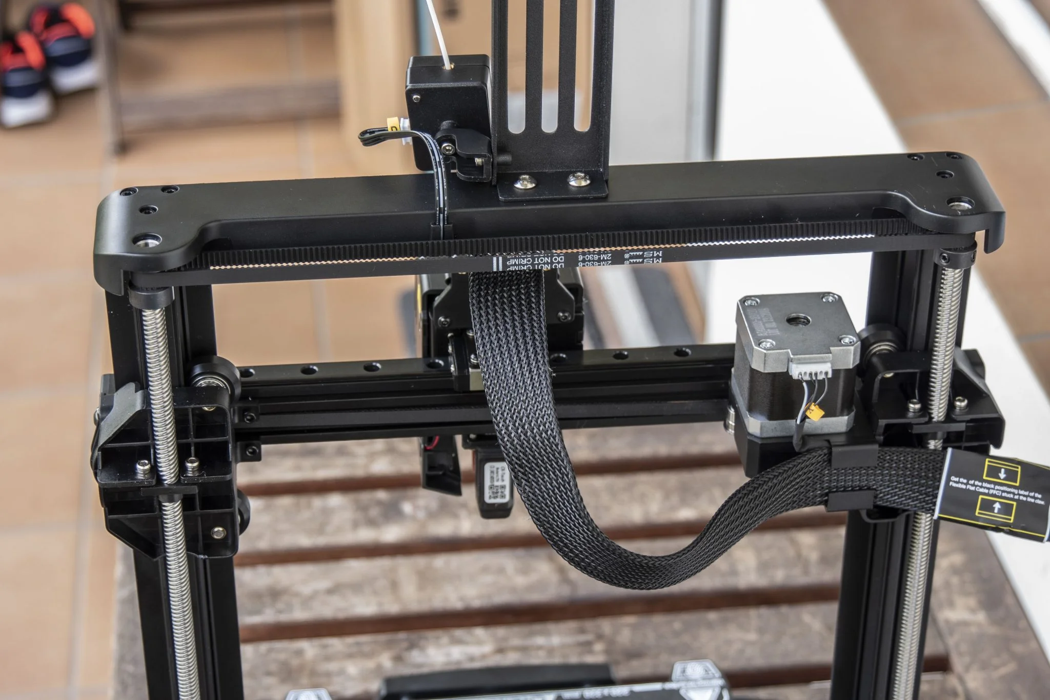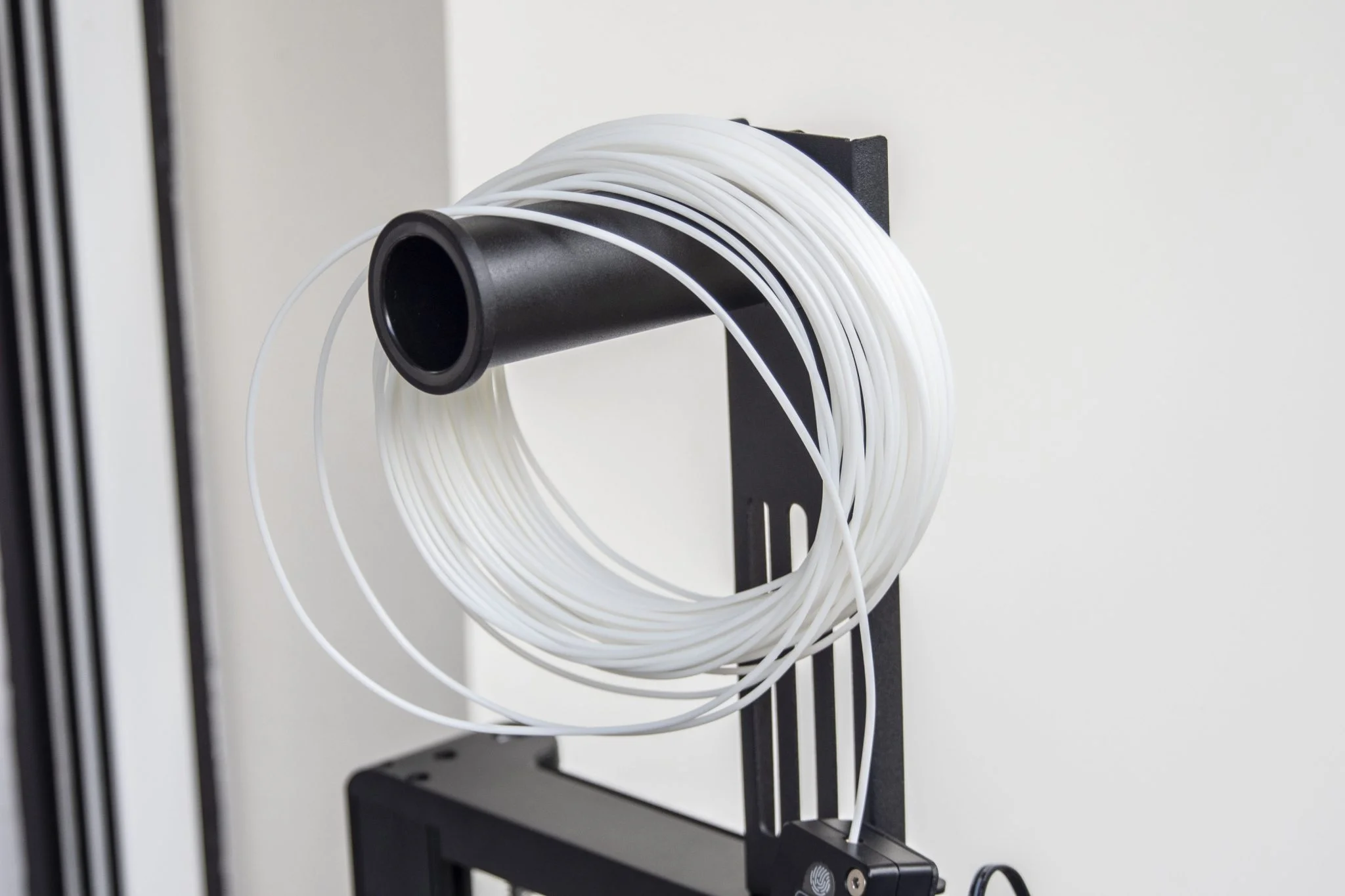 esta es la mejor solución en lugar de la de rueda/cojinete, y pasó de las máquinas de gama alta anteriores al segmento de nivel de entrada. El eje está sostenido por dos husillos guía, lo que significa que permanece bastante estable durante la impresión, aunque Es una impresora 3D rectilínea., es decir, a diferencia de los modelos Core XY, como el Crealidad K1C o Crealidad K1 Max - aquí el escenario avanza y retrocede. Esto también significa que los cables hacia atrás, que son responsables, entre otras cosas, del calentamiento de los objetos, ocupan mucho espacio. Entonces, si la empujas contra una pared, gira la impresora o deja espacio detrás. ¿No es bueno que el portafilamentos esté arriba y no al costado? Es mucho más fácil colocarlo en cualquier lugar. Veamos cómo se imprime.