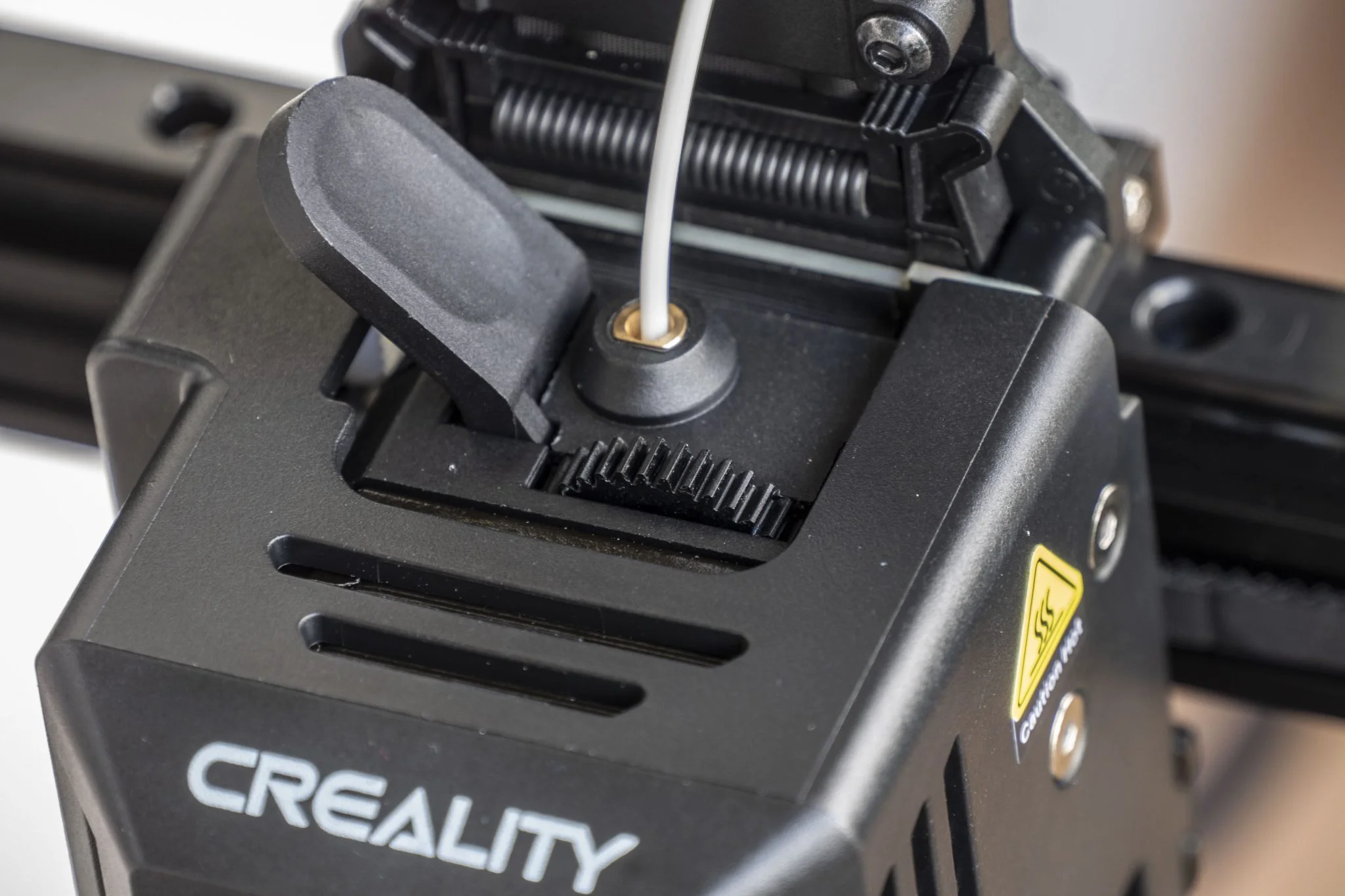 el otro es el portafilamentos. He visto tantas malas soluciones a esto que pedí soportes de filamentos con cojinetes separados a Ali, porque casi todos los diseños de fábrica son una mierda. O están en el lugar equivocado o estiran el material o el tubo por el que pasan es demasiado largo. No es así con la Creality Ender 3 V3-KE donde la solución es casi perfecta. De una manera muy corta, el material pasa a través del sensor de agotamiento, que también es uno cuelga de un tornillo que puede moverse en todas direcciones. No puede atascarse, tensarse ni romperse., mientras que el material debe introducirse en la cabeza con la ayuda de una lámina retráctil que, cuando se suelta, encaja perfectamente en su lugar.