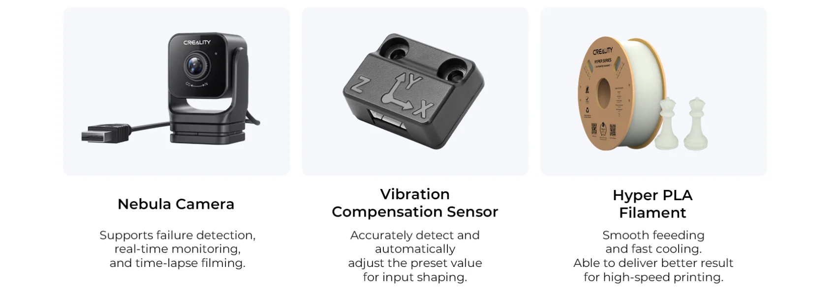 Además, es muy amigable para principiantes, esta solución es mucho mejor que en el caso de Ender 3 V3. Y el rollo de filamento en sí se coloca encima de la máquina, por lo que no cuelga hacia un lado y es fácil colocarlo en cualquier mueble. GRACIAS por tener un ingeniero que puede pensar en Creality. El resto de parámetros del menú son los habituales, se consiguió prácticamente todo lo necesario, pero cualquiera que haya visto una Creality moderna los ha visto todos. Curiosamente, hay 3 puertos USB en el lateral de la pantalla Creality Ender 3 V2-KE, puedes conectar la unidad flash a una, la cámara adicional a la otra, el cual deberás buscar bajo el nombre Creality Nebula, y en principio el sistema lo reconocerá automáticamente. De hecho, puedes llevarlo contigo. sensor de vibración sensor acelerómetro lo que en principio hará que la impresión sea aún más bonita.