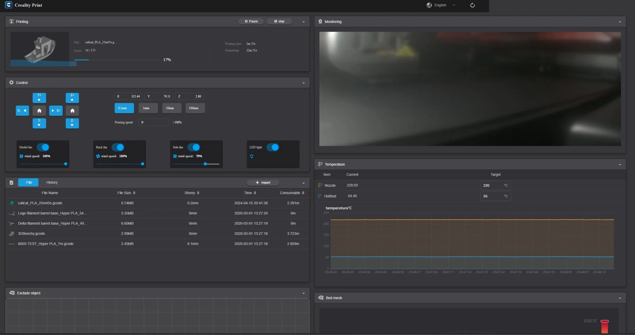 Vale la pena mencionar algunas palabras más sobre la cámara incorporada de la impresora 1D Creality K3C. Al principio esto parece una característica atractiva para la vista, pero tiene muchos usos prácticos. Por un lado Puedes monitorear el proceso de forma remota en 720p., puede vídeo de lapso de tiempo hacer con él, y por otro lado es para la detección automática de fallos esta es su base. Esto significa que si deja un modelo en la plataforma extraíble magnéticamente, la impresora le avisará para que lo retire antes de iniciar un nuevo flujo de trabajo. Por supuesto, también estaba equipada la impresora 1D Creality K3C. con protección contra agotamiento, e incluso en caso de un corte de energía, puede continuar trabajando desde donde se interrumpió, para que no tengas que comenzar a imprimir los modelos nuevamente.