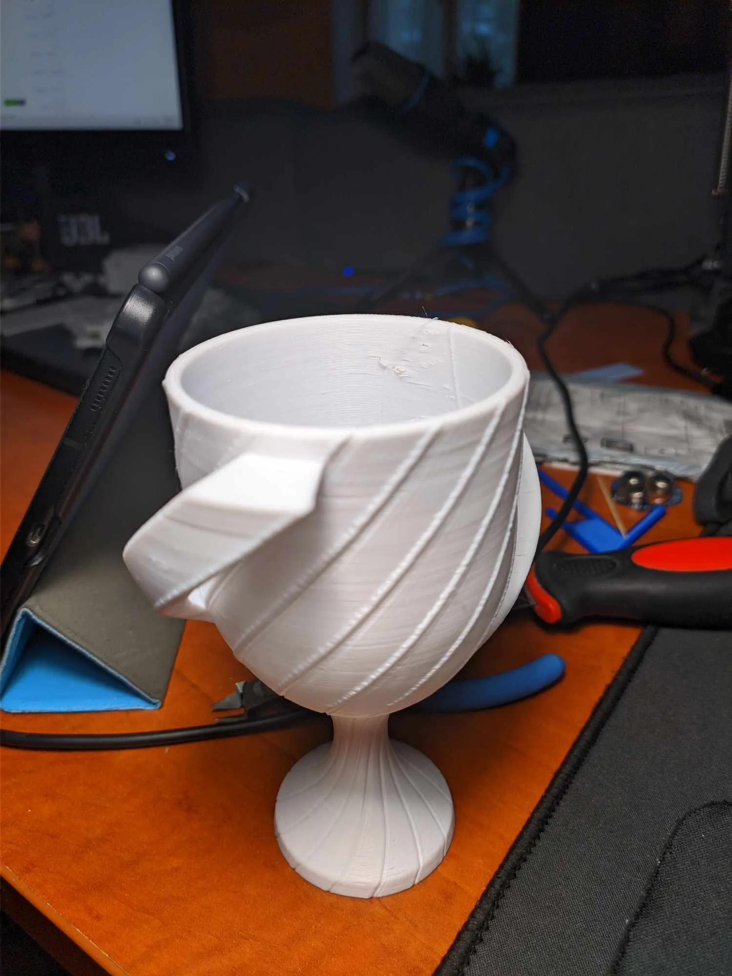 velocidad del ventilador, temperatura del cabezal, proceso de calibración, tiempo restante para imprimir, prácticamente todo. El proceso es muy informativo, es casi un placer observar el trabajo, y mientras lo hacía, sentí que de alguna manera irradiaba concentración desde el dispositivo. Sin embargo, la impresora 1D Creality K3C tiene un punto débil molesto: la iluminación LED. La luz fluye hacia adentro desde un solo lugar, el frente, lo cual es un problema porque el objeto a menudo está cubierto por el cabezal de impresión, por lo que el modelo aparece en sombras. Esta es una solución bastante aburrida, ¿por qué no se pueden instalar 2 o 3 LED más de cinco florines en la casa?