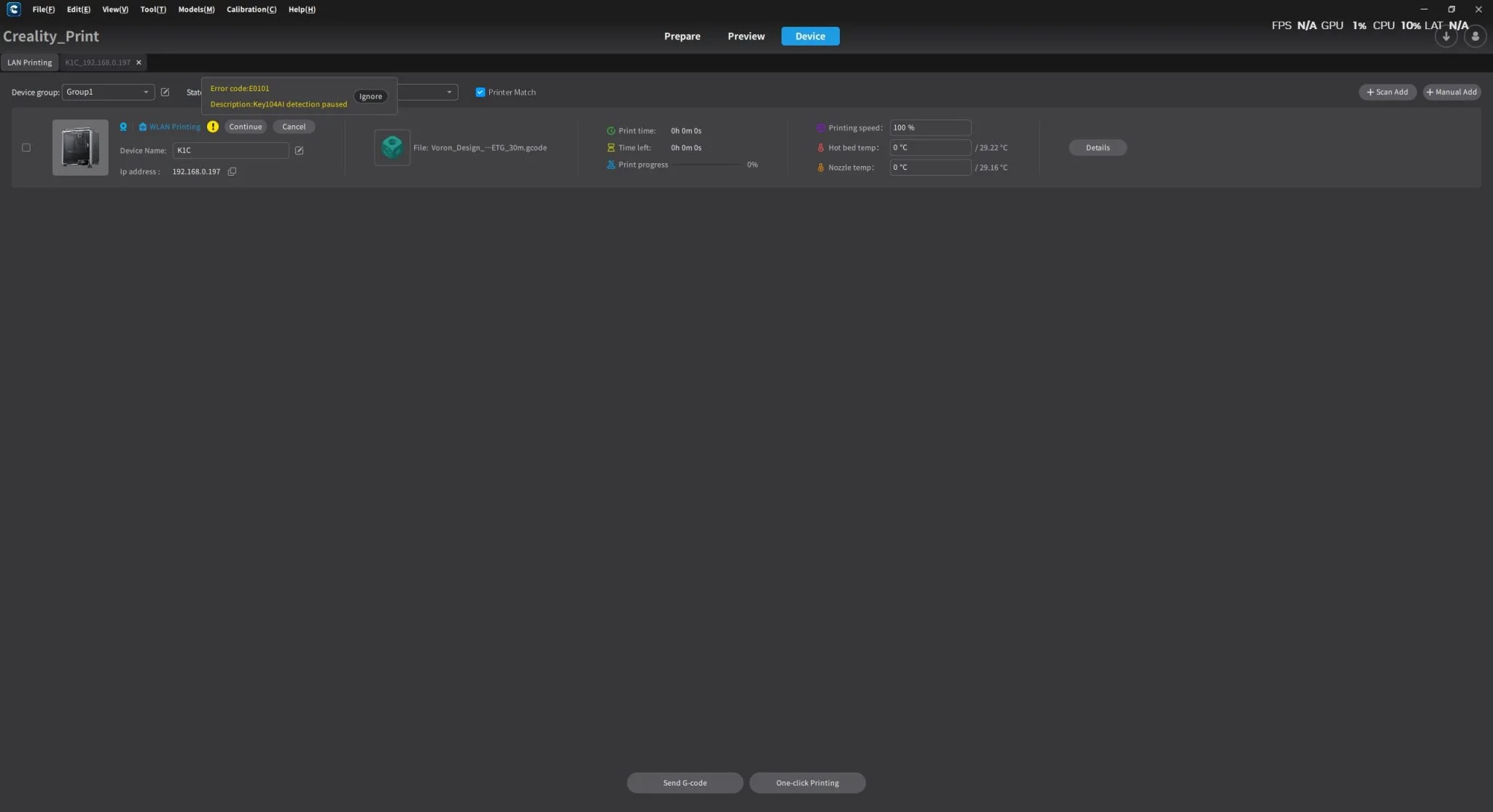 por lo que no tendrás que utilizar el sistema de Cura, Prusa, Orca, Bamboolab o cualquier otro fabricante. Creality Print encontró la impresora 1D Creality K3C en la red incluso sin iniciar sesión en la nube y Puede leer más datos de su firmware que los demás. Es una pena que sea todo un montón de tonterías., a veces marca mal los ejes, o no es posible sobrescribir algunos datos, pero también pasa que vuelve a poner un valor predeterminado en lugar de la temperatura especificada. Afortunadamente, suele producir falsos positivos, por lo que no puedes hacer ningún daño con él, pero su funcionamiento poco convincente resulta molesto.