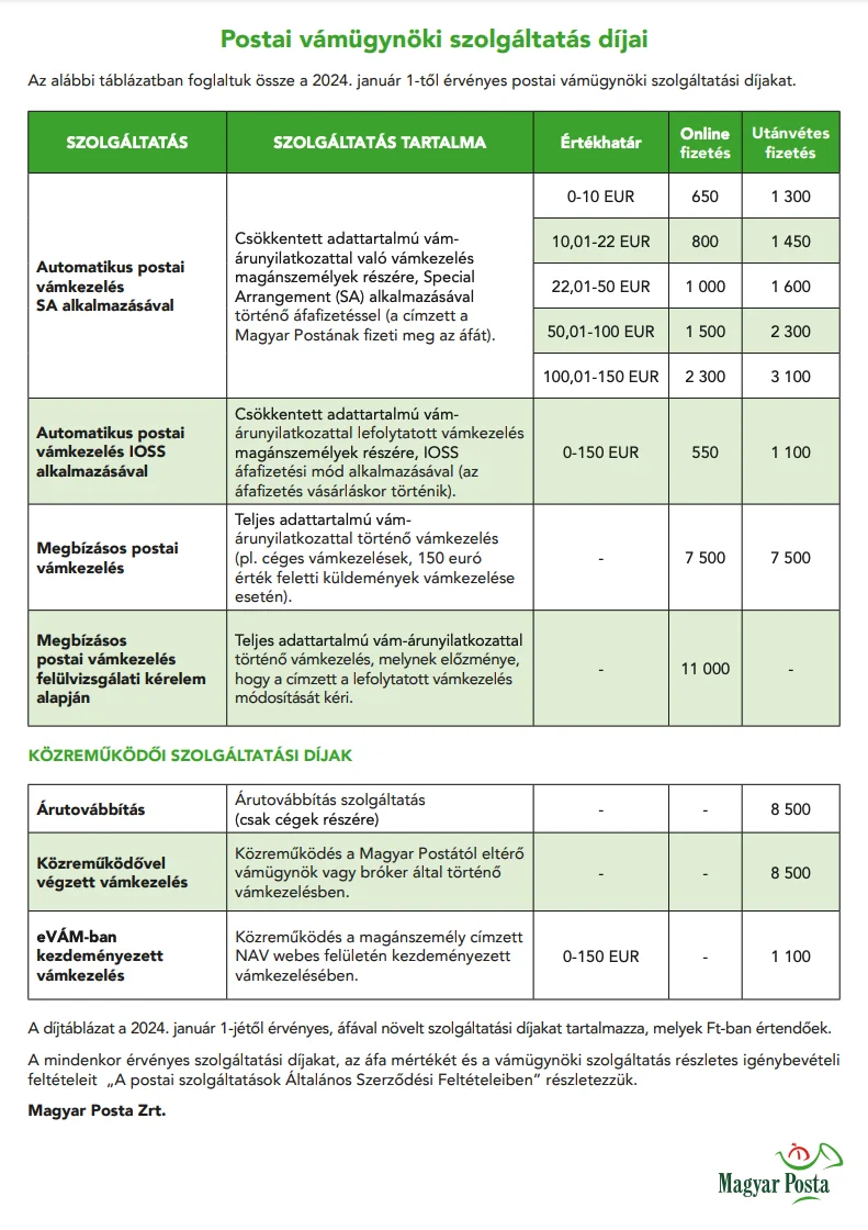 A bejövő csomagok jelentős részét a Magyar Posta kezeli. A 150 euró alatti értékű csomagok esetén lehetőség van az új, csökkentett adattartalmú vámáru nyilatkozattal elvégezni a vámeljárást, ami a korábban megszokotthoz képest jóval kevesebb adatot kér, ezáltal gyorsabb és a legtöbb esetben a címzett beavatkozása nélkül, automatikusan elvégezhető. Ennek megfelelően csökkentek a vámügyintézési költségek is, új sávos rendszer került bevezetésre. A díjat egy új online rendszerben is ki lehet fizetni, így jelentősen csökkentve a fizetendő összeget. Az alábbi díjakat alkalmazzák: