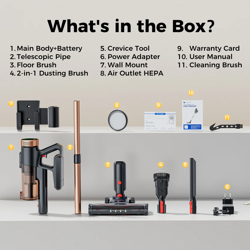 A tube métallique télescopique réglable, afin que chacun puisse l'ajuster à sa propre taille, Unité principale de 1,6 kg et c'est si facile que les escaliers, les étagères ou même les toiles d'araignées sous le plafond ne constituent pas un obstacle. Dans la boîte, vous trouverez tout ce dont vous avez besoin : unité principale, brosse à rouleau en V, tube métallique, adaptateur secteur, support mural, têtes multifonctions et manuel d'utilisation.