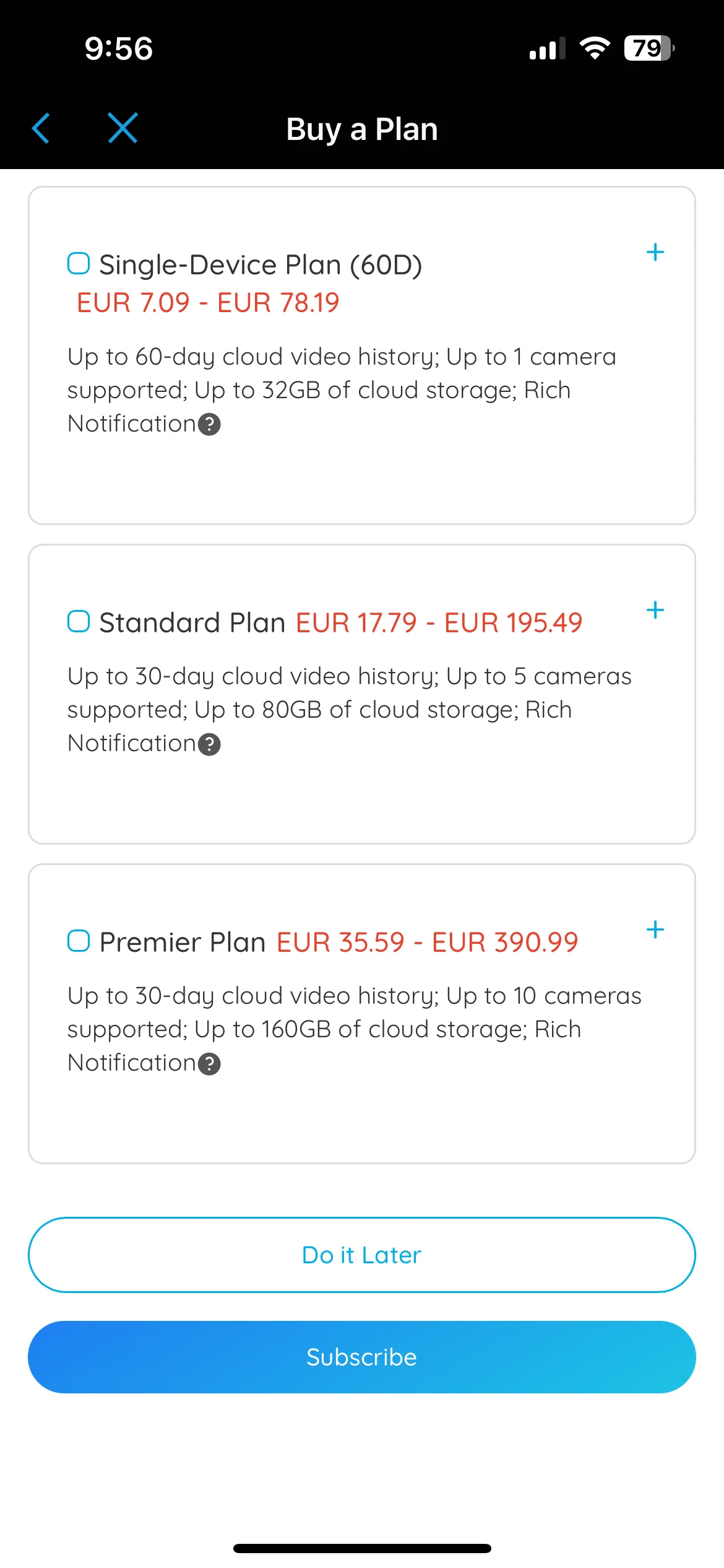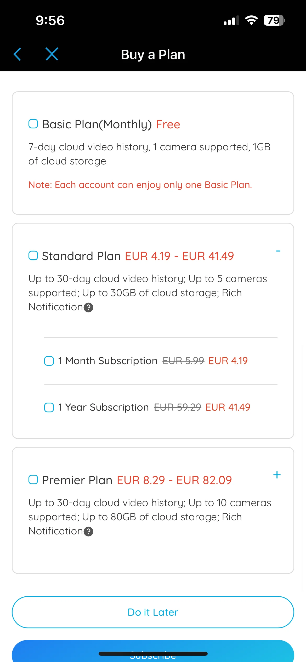 Reolink fournit stockage en nuage également pour les utilisateurs, dans la version gratuite, vous bénéficiez de 1 Go de stockage pour une caméra et de 7 jours de stockage d'enregistrement, mais le Plan Standard comprend déjà 5 caméras, 30 Go de stockage et 30 jours de stockage pour 4,19 € par mois ou 41,49 € par an. Si vous souhaitez connecter encore plus de caméras Reolink, le Plan Premier peut déjà gérer 10 caméras, en plus de fournir 80 Go d'espace de stockage, en échange de 8,29 euros par mois ou 82,09 euros par an. Mais tout cela n’est pas nécessaire si vous avez acheté un Home Hub.