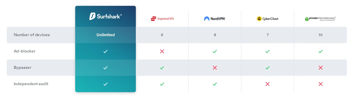 Cela ne semble pas très grave, mais par exemple, nous avons dû installer le client Surfshark sur 2 téléphones, 2 ordinateurs portables et une tablette - et nous n'avons pas de télévision intelligente et aucun autre membre de la famille dans le foyer - et généralement, les concurrents n'autorisent que 5 à 7 appareils dans le cadre d'un abonnement, et Surfshark un nombre infini.