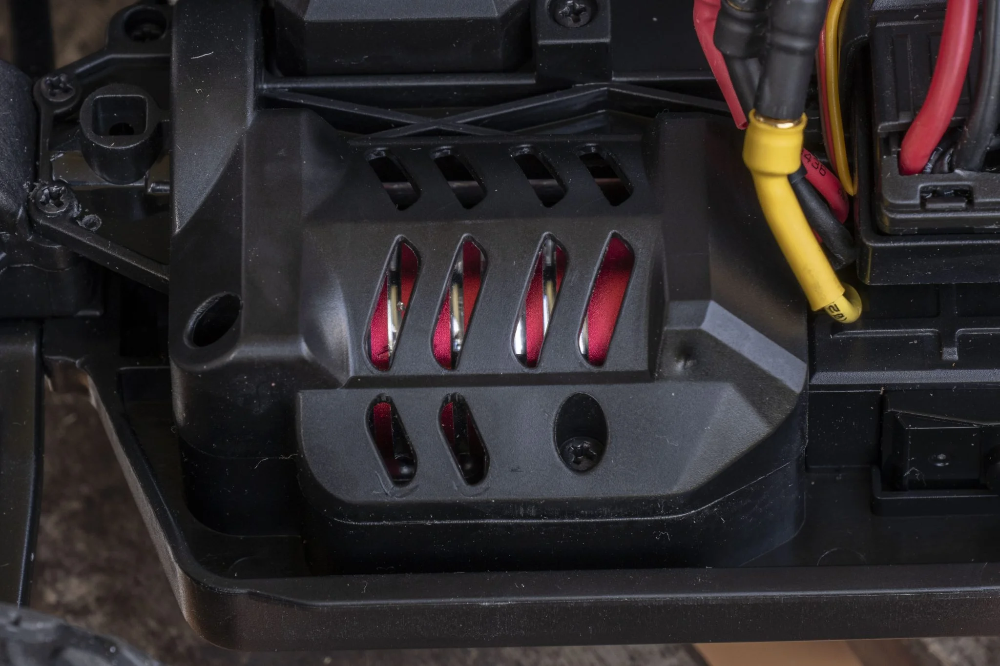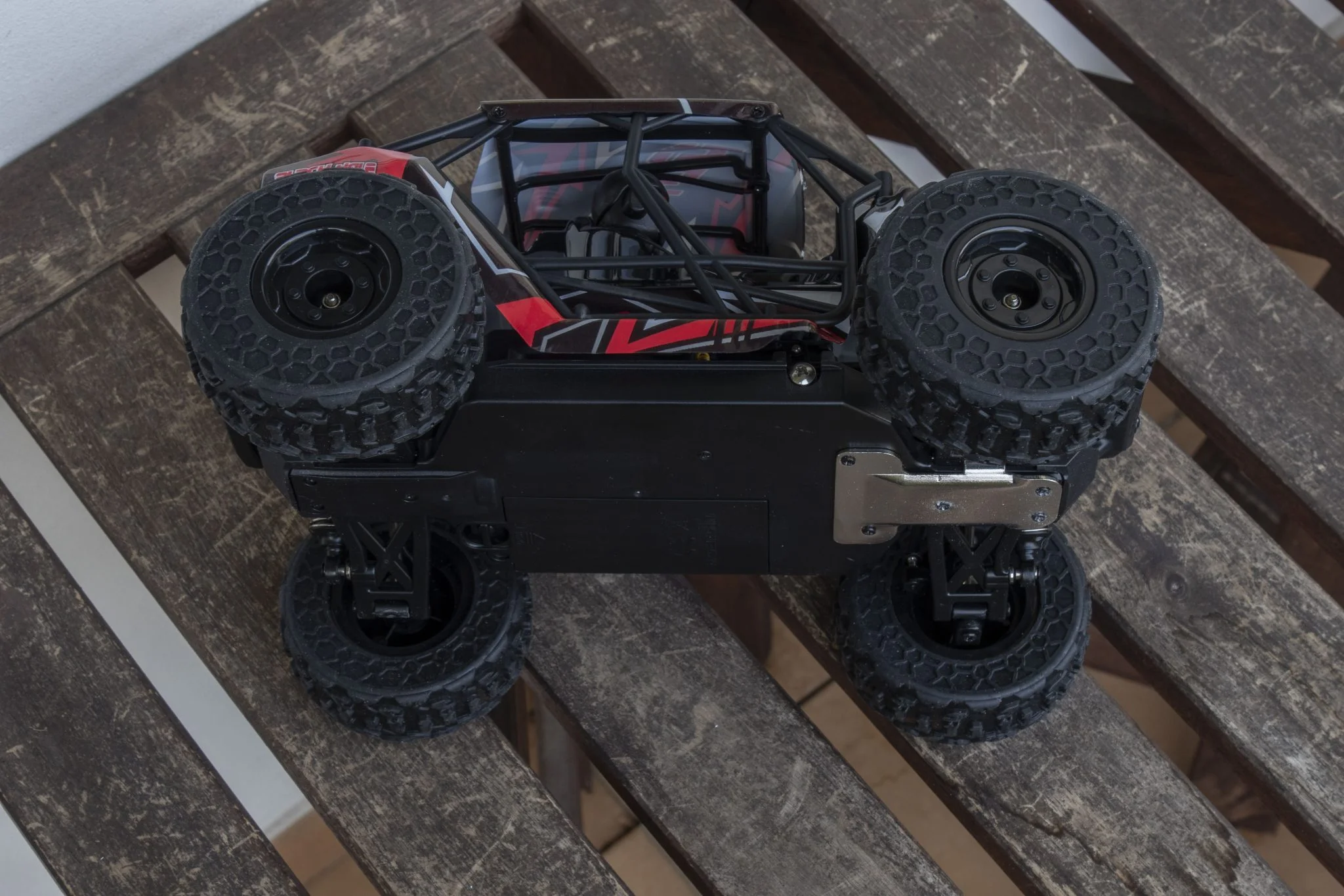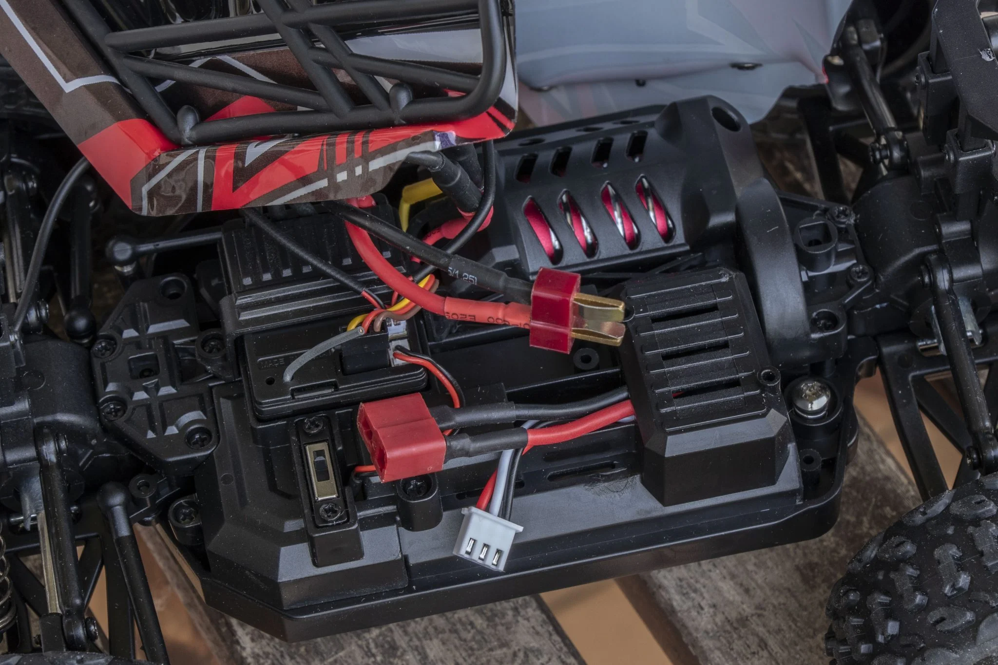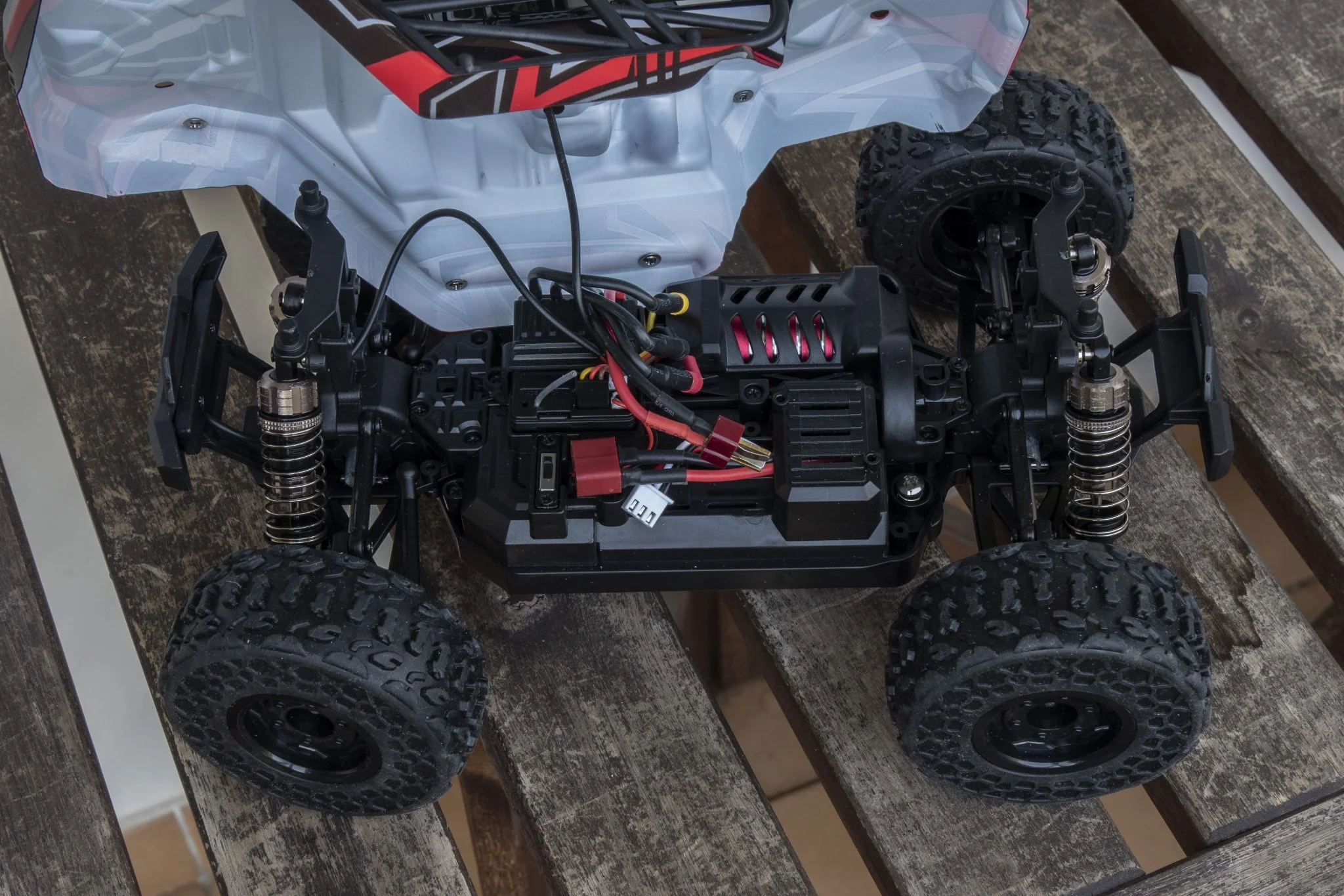 et ce serait dommage de rater ce spectacle dans le noir. La plupart des éléments du châssis sont en métal, par exemple les ressorts, qui étaient les versions en aluminium développées ici, remplis d'huile., ce qui est un gros plus à ce niveau. Il aide beaucoup à amortir les sauts et est également plus durable que les solutions traditionnelles. Le reste des éléments du châssis est en plastique, mais l'arbre de transmission est ici également en métal, ce qui est bien. Les pneus sont suffisamment gonflés, ce qui est bénéfique car il pourra grimper de nombreux endroits Échelle 1:18, véhicule à quatre roues motrices, bien que cette taille soit un peu petite pour les herbes hautes. Derrière se trouvent le bouton d'alimentation et un connecteur Deans/T-plug dans lequel la batterie doit être insérée. Le numéro 2345 est de 4000 KV - ce qui signifie seulement de combien la vitesse augmente pour une augmentation de 1 V -, moteur il était caché sous un boîtier en plastique, ce qui est dommage. S'il fait chaud, la chaleur doit être évacuée, ce pour quoi un dissipateur thermique en cuivre serait certainement plus adapté qu'un dissipateur en plastique.