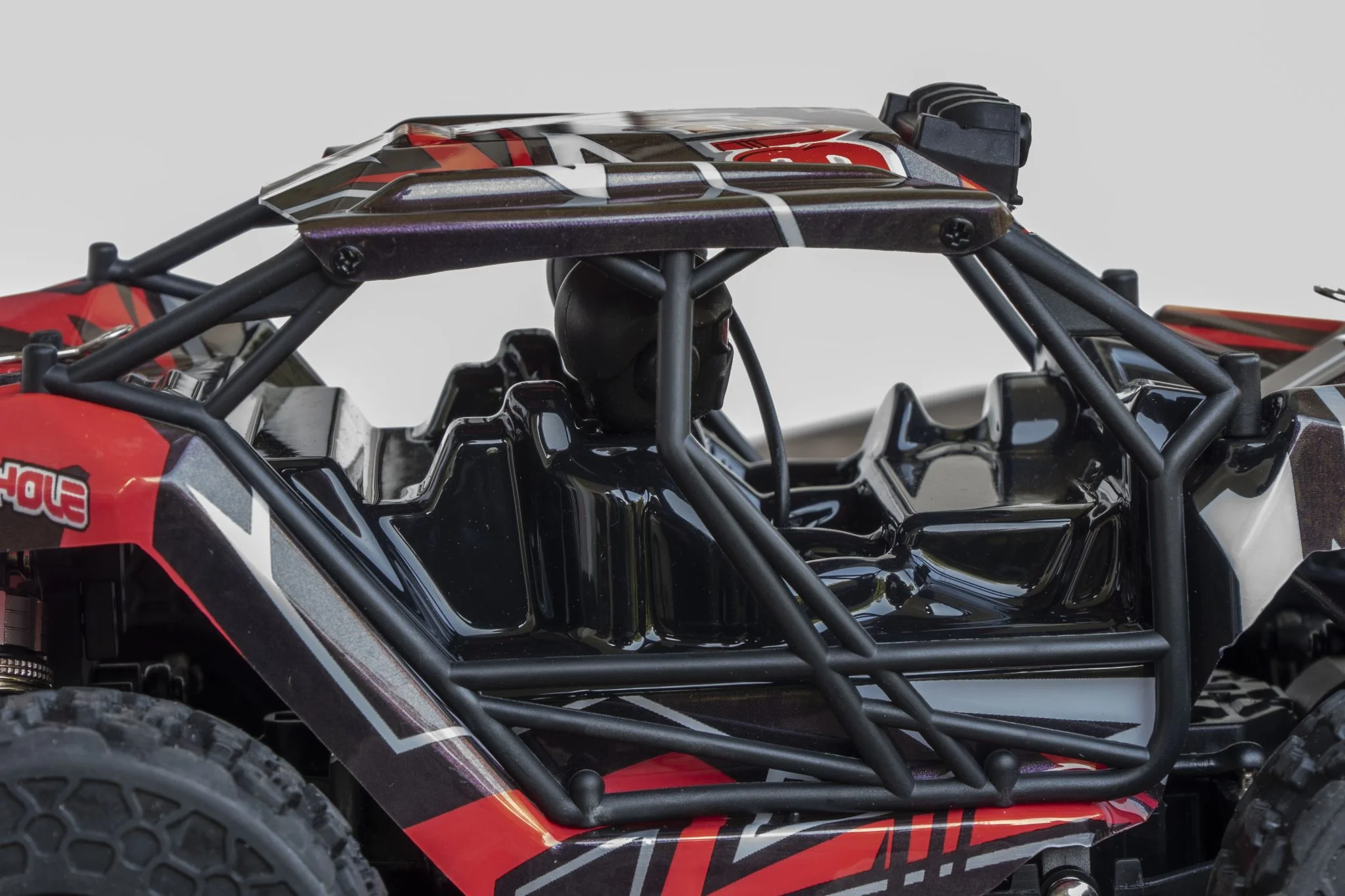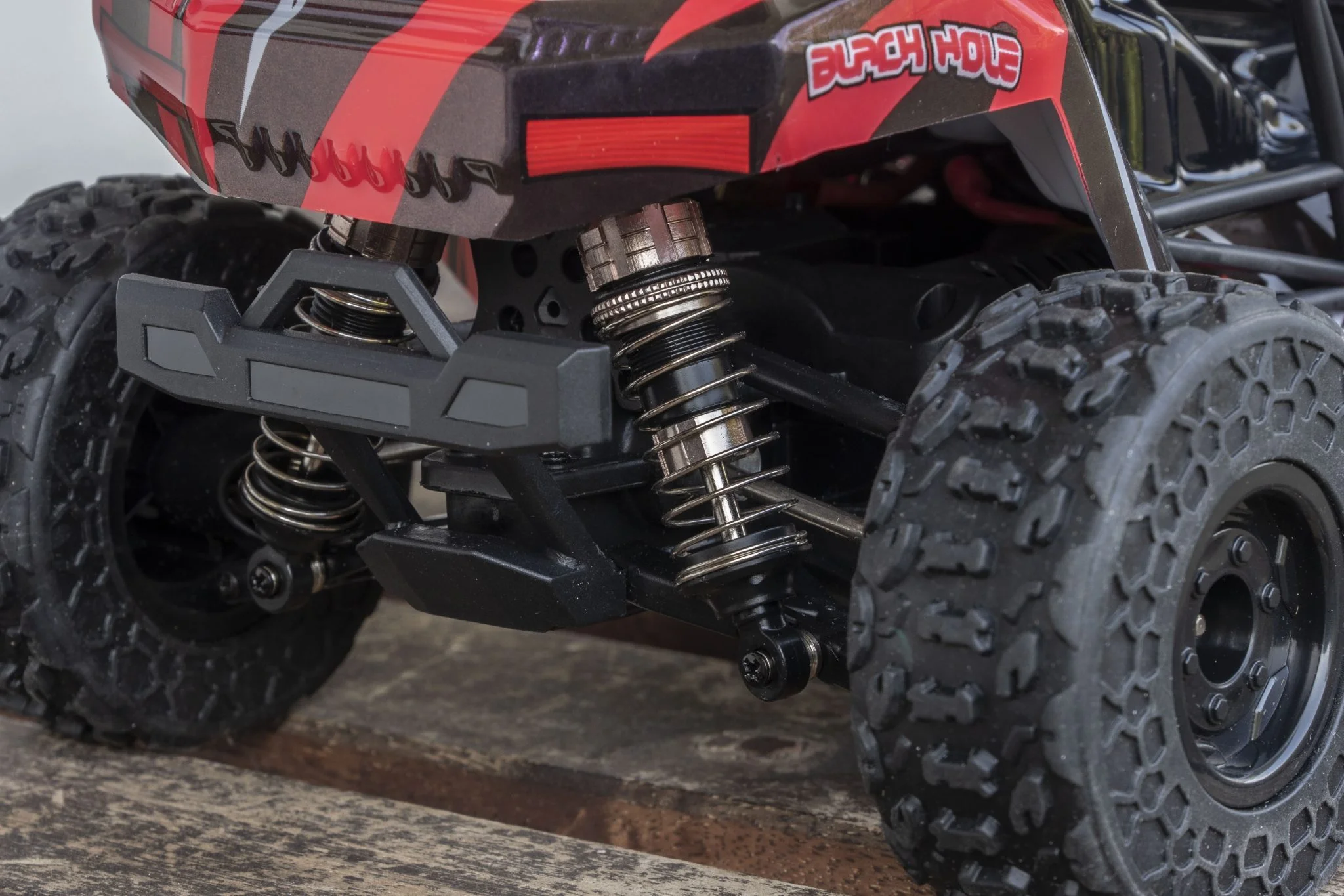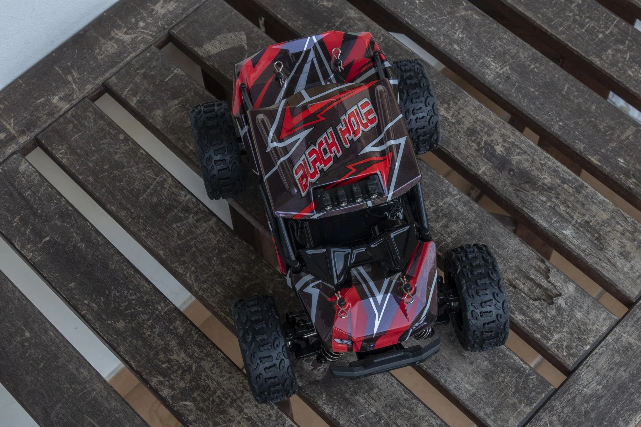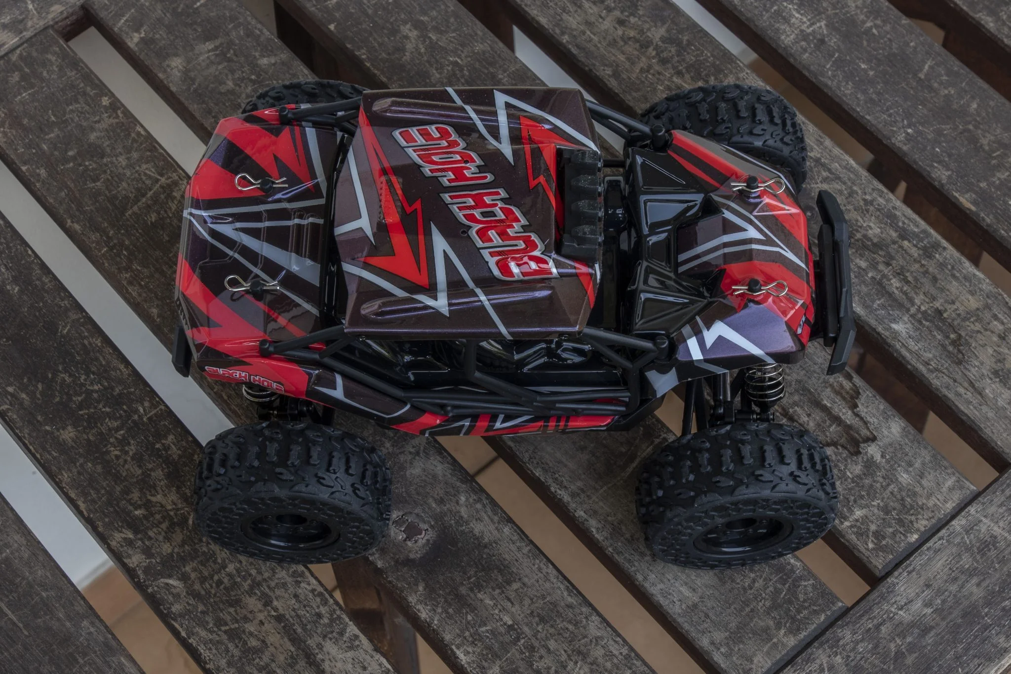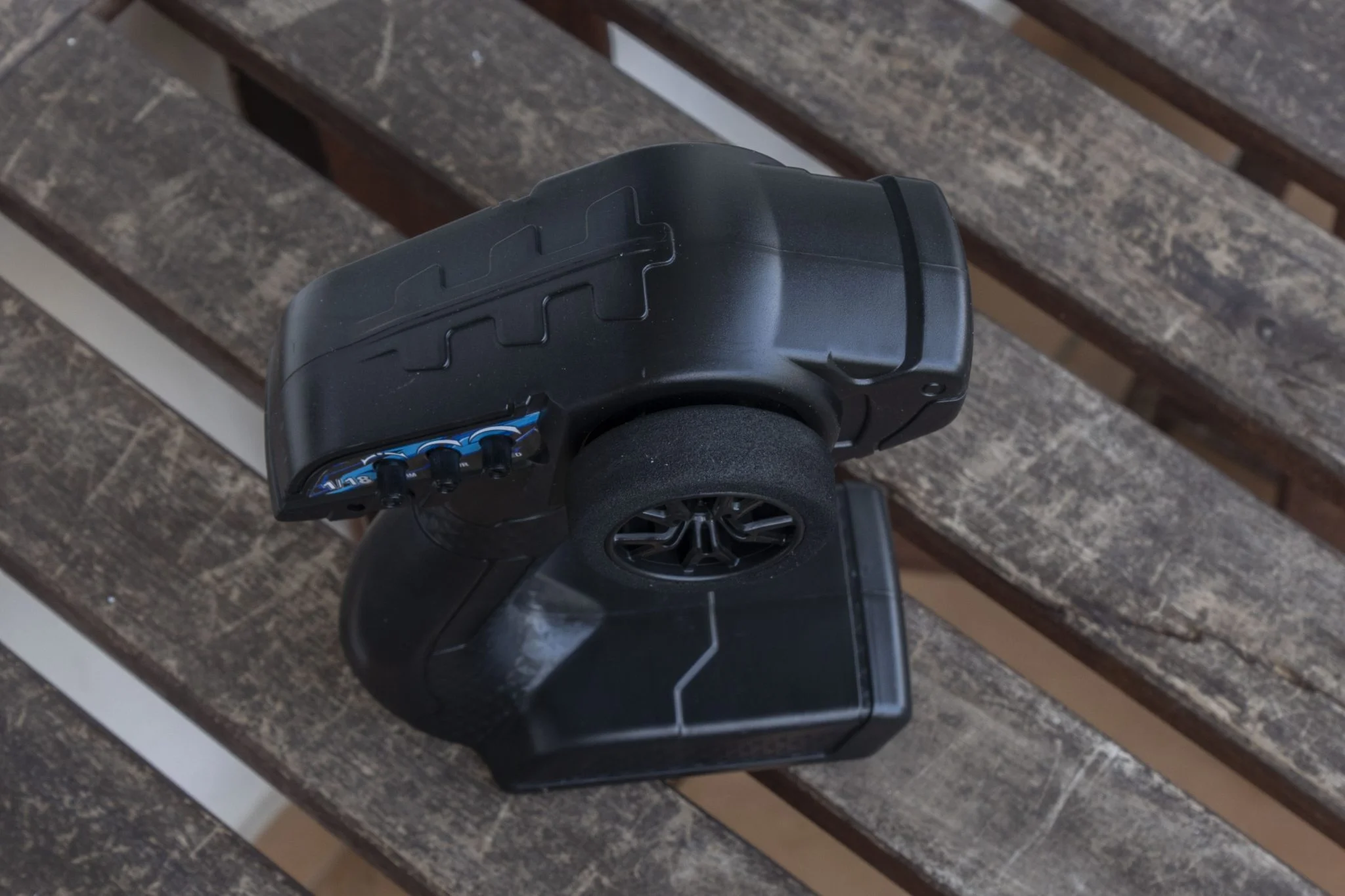 et ce serait dommage de rater ce spectacle dans le noir. La plupart des éléments du châssis sont en métal, par exemple les ressorts, qui étaient les versions en aluminium développées ici, remplis d'huile., ce qui est un gros plus à ce niveau. Il aide beaucoup à amortir les sauts et est également plus durable que les solutions traditionnelles. Le reste des éléments du châssis est en plastique, mais l'arbre de transmission est ici également en métal, ce qui est bien. Les pneus sont suffisamment gonflés, ce qui est bénéfique car il pourra grimper de nombreux endroits Échelle 1:18, véhicule à quatre roues motrices, bien que cette taille soit un peu petite pour les herbes hautes. Derrière se trouvent le bouton d'alimentation et un connecteur Deans/T-plug dans lequel la batterie doit être insérée. Le numéro 2345 est de 4000 KV - ce qui signifie seulement de combien la vitesse augmente pour une augmentation de 1 V -, moteur il était caché sous un boîtier en plastique, ce qui est dommage. S'il fait chaud, la chaleur doit être évacuée, ce pour quoi un dissipateur thermique en cuivre serait certainement plus adapté qu'un dissipateur en plastique.