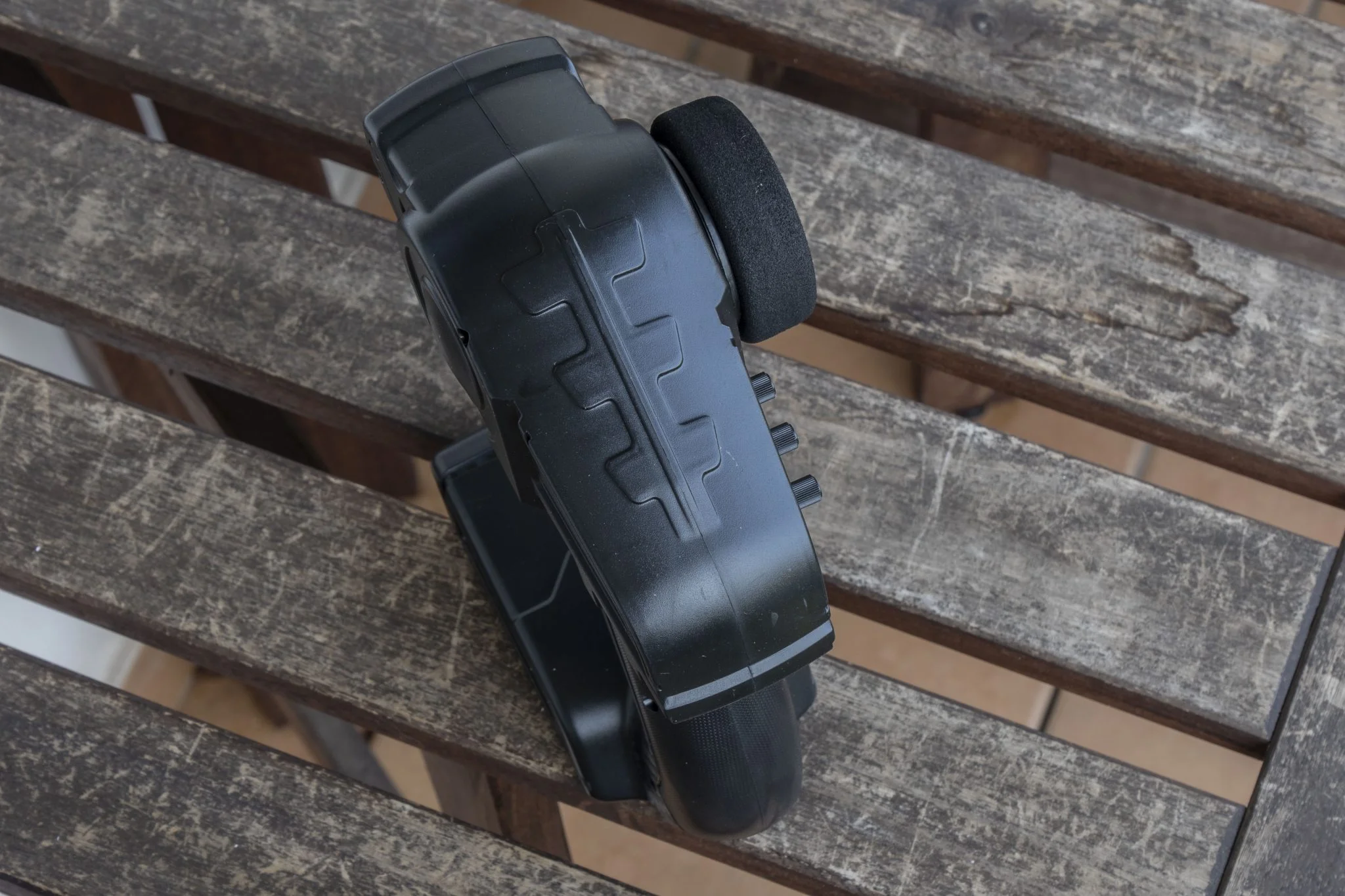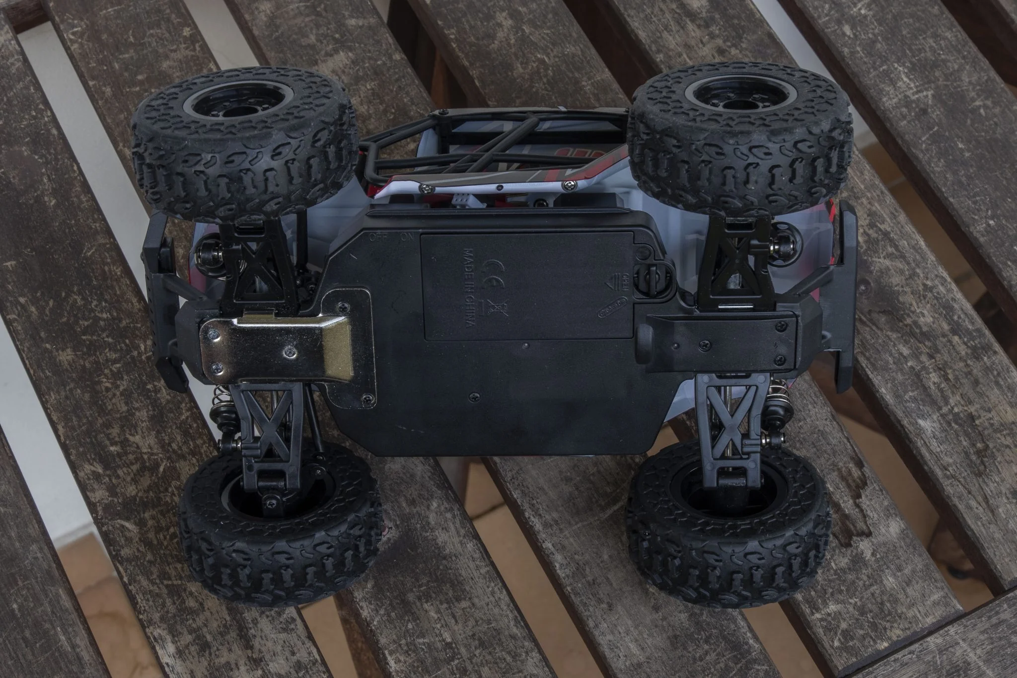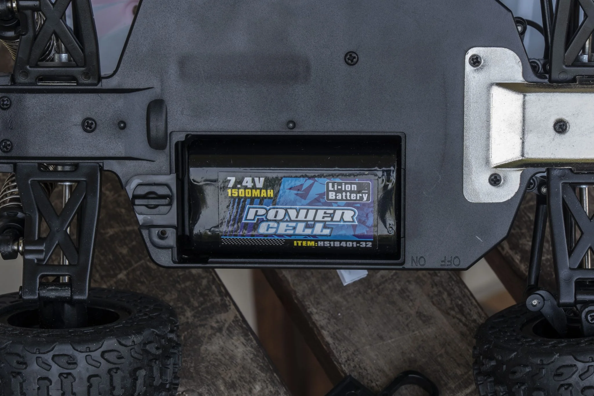 J'ai regardé où se trouvait le support de batterie et j'ai réalisé qu'il était sur son ventre et que le rangement pouvait être ouvert par le bas avec un clip en plastique. À certains égards, c'est une mauvaise solution, car il reçoit continuellement la courbe du bas. C'est bien d'avoir un grattoir en métal devant, mais cela ne protégera pas non plus la porte en plastique derrière des pierres. Cependant, c'est bien du point de vue qu'il est facile de changer la batterie, mais une solution Velcro peut également le faire. La source d'alimentation est une 2 cellules, unité de 1500 XNUMX mAh, cette capacité est suffisante pour un véhicule de cette taille. Je ne dis pas qu'un 3S aurait été mieux, car ils peuvent être utilisés pour construire des véhicules encore meilleurs, mais c'est suffisant pour une telle masse. sur la base des mesures en ligne, ce ne sera finalement que 35-38. Il n'y a pas beaucoup d'espace dans le compartiment à piles, donc les piles plus grosses ne pourront pas y entrer.