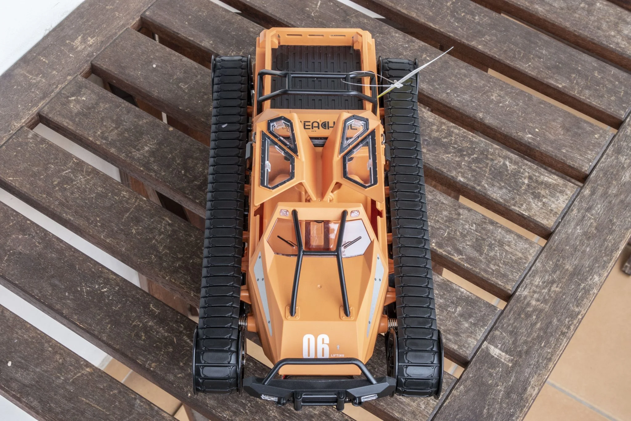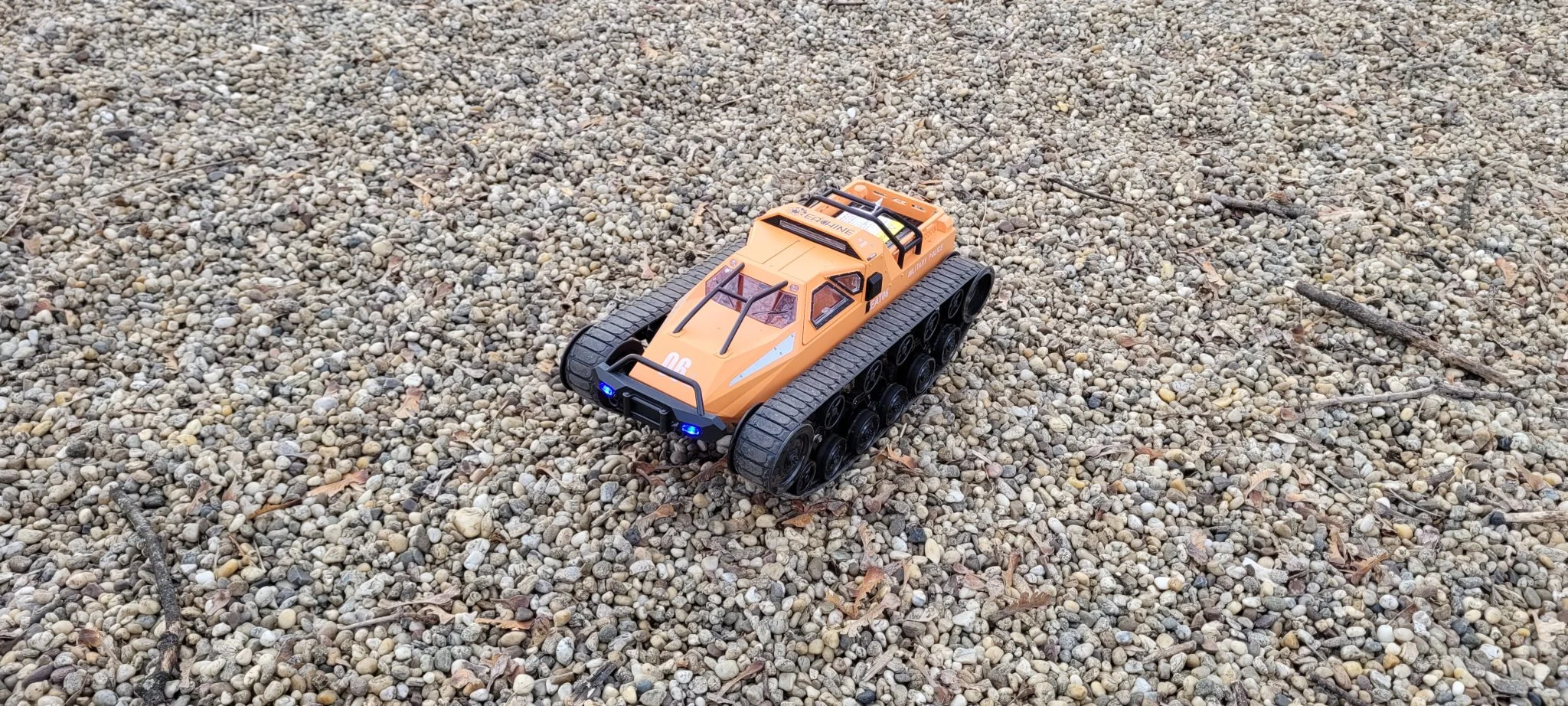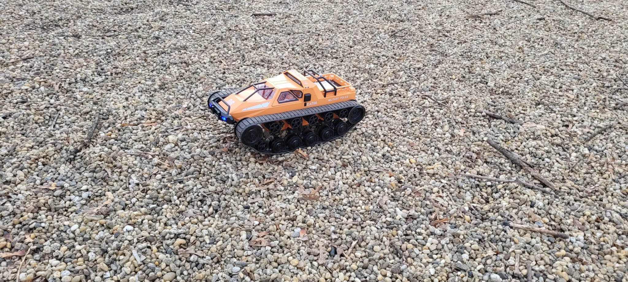 A taille du véhicule 34,3×17,4×14,5 cm, son poids 1,375 kg, donc ça a vraiment de la substance, mais ni la taille ni le poids ce n'est pas un problème pour lui de progresser. Nous l'avons testé, il s'est senti aussi à l'aise sur l'herbe, le sable, le gravier, le béton et les scories.