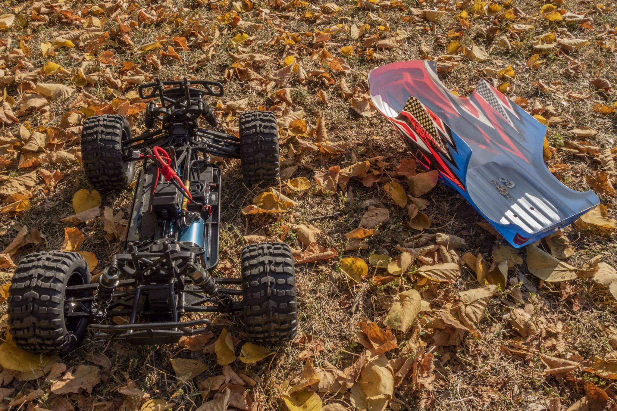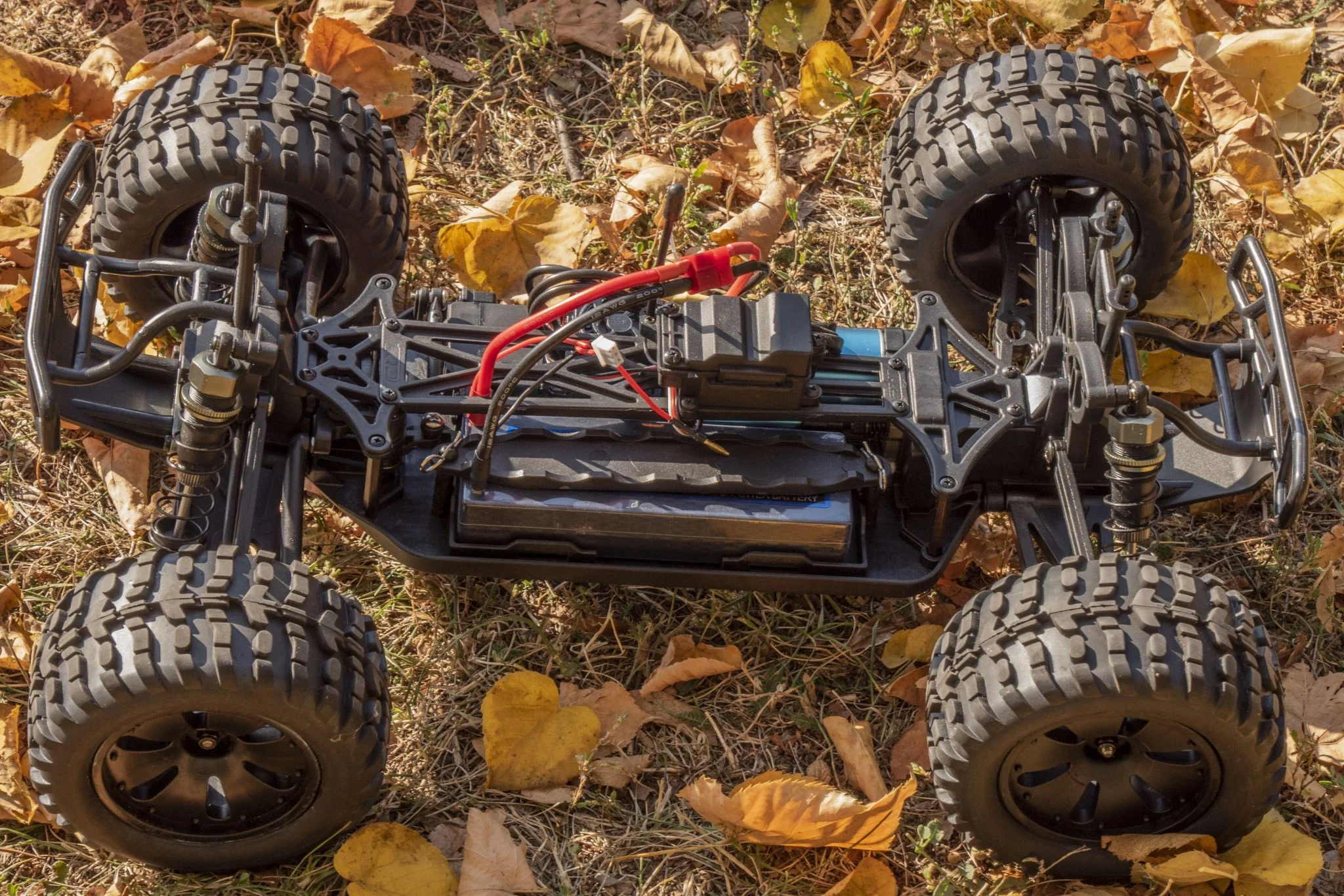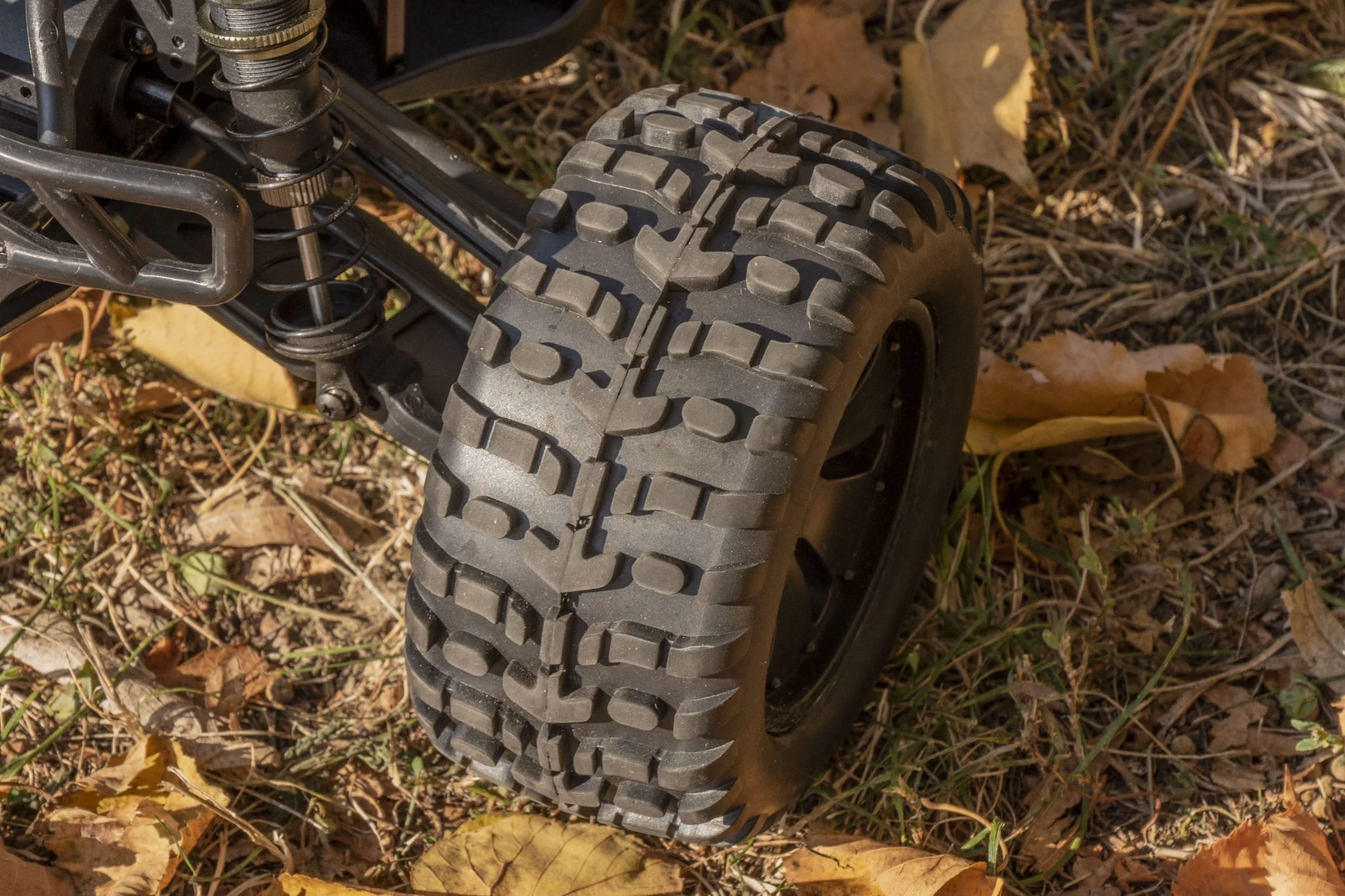 La machine a suffisamment de puissance pour creuser le sol, et cela est probablement dû au moteur BLDC et au fait que les pneus sont particulièrement cambrés. De ce fait, il peut bien tenir et transférer suffisamment la force, bien mieux que son petit frère du ZD Racing Raptor BX-16. Je ne pense pas que ce soit un défaut, je préfère appeler cela une caractéristique selon laquelle l'avant de la voiture télécommandée est plus haut que l'arrière, de ce fait, c'est comme si vous conduisiez constamment à plein régime. De ce fait, il a cependant tendance à se jeter en arrière lors d'un flip, ce qui n'est pas particulièrement grave, il pousse tout au plus un saut périlleux. Cela a l'air bien, mais je ne suis pas sûr que ce soit le secret de la longévité du cadre.