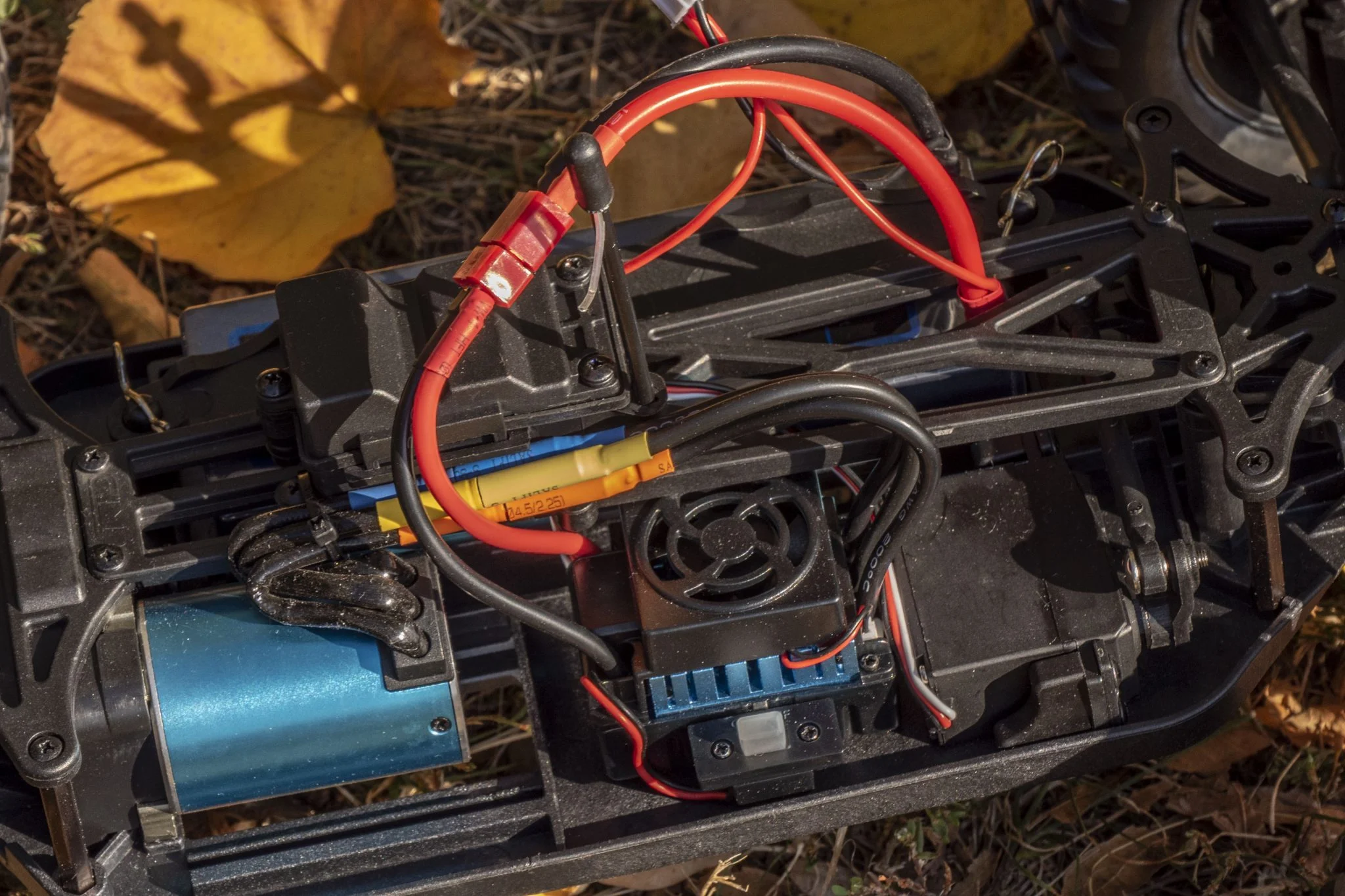 Si vous retirez la couverture, l'intérieur apparaîtra, où j'ai repéré deux choses à la fois. D'une part, qu'il dispose d'un moteur sans balais - qui est la solution la plus durable - et que l'ESC - "électronique de contrôle de vitesse" - reçoit un refroidissement actif, qui est automatiquement démarré par le bouton d'alimentation. Il est intéressant de noter que la batterie Li-Po est du type boîtier rigide, c'est-à-dire qu'elle est cachée dans un boîtier rigide, et qu'il y a une branche + séparée qui peut être branchée et déconnectée, ce qui est nécessaire pour équilibrer la tension des cellules. .