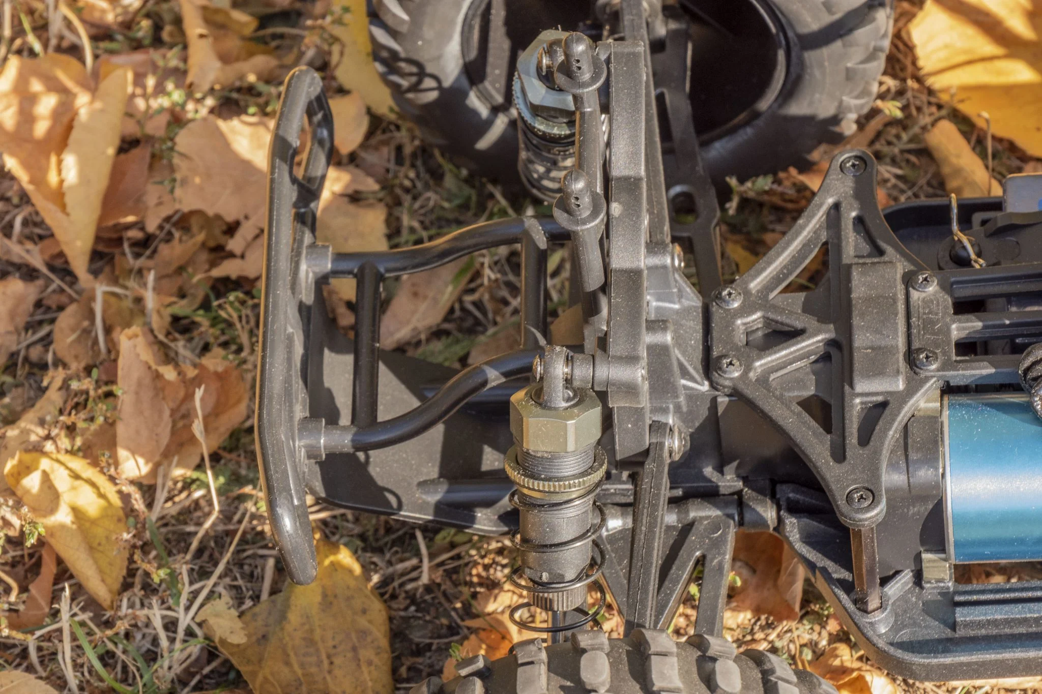 La plupart des éléments du cadre et du châssis sont en plastique. Vous n'avez pas à avoir peur de cela, car ils se cassent moins que le métal, ils se plient plutôt et dissipent bien l'énergie pendant le saut. En revanche, les points de connexion contiennent déjà des pièces métalliques, ainsi que les ressorts hélicoïdaux et l'arbre à cardan - puisque la machine est équipée d'une transmission intégrale - fabriqués dans ce matériau. Vous pouvez régler la tension du ressort avec la vis située en haut de la tour à ressort. Globalement, le matériel est adapté au prix, il y a de fortes chances qu'il puisse résister à l'usure, s'il y a un point faible quelque part, c'est le servo, j'achèterais là-dessus. Cela vaut peut-être la peine de prêter attention aux engrenages du différentiel, mais je n'ai pas pu déterminer leur matériau sans les démonter, vous ne pouvez donc que deviner la tendance au cisaillement, pour moi, ils ont résisté pendant le test.