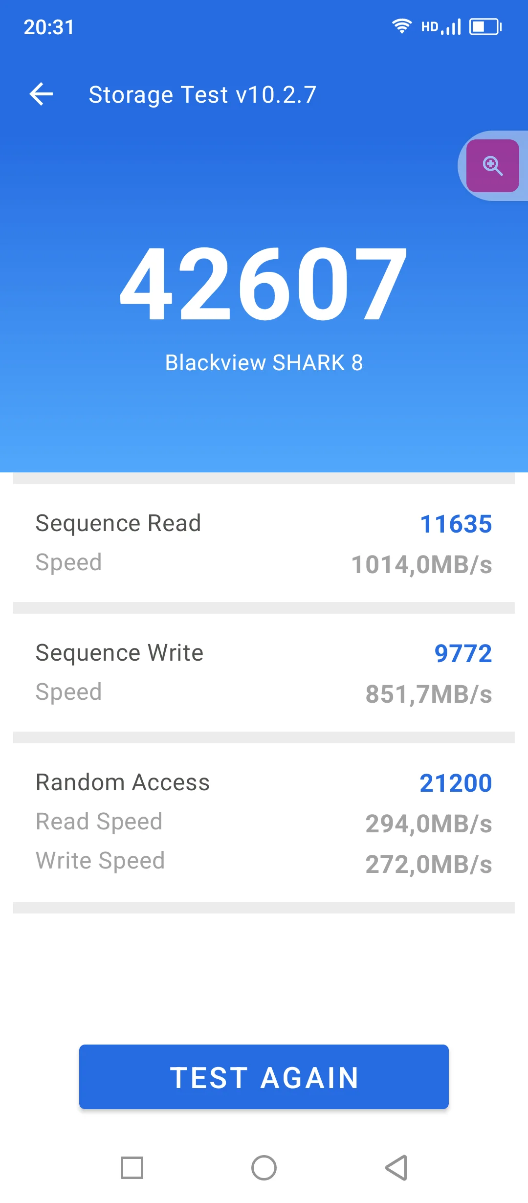 - Testeur de stockage Antutu, écriture/lecture: 42 607 points ; 1014 851/XNUMX Mbit/s (séquentiel)