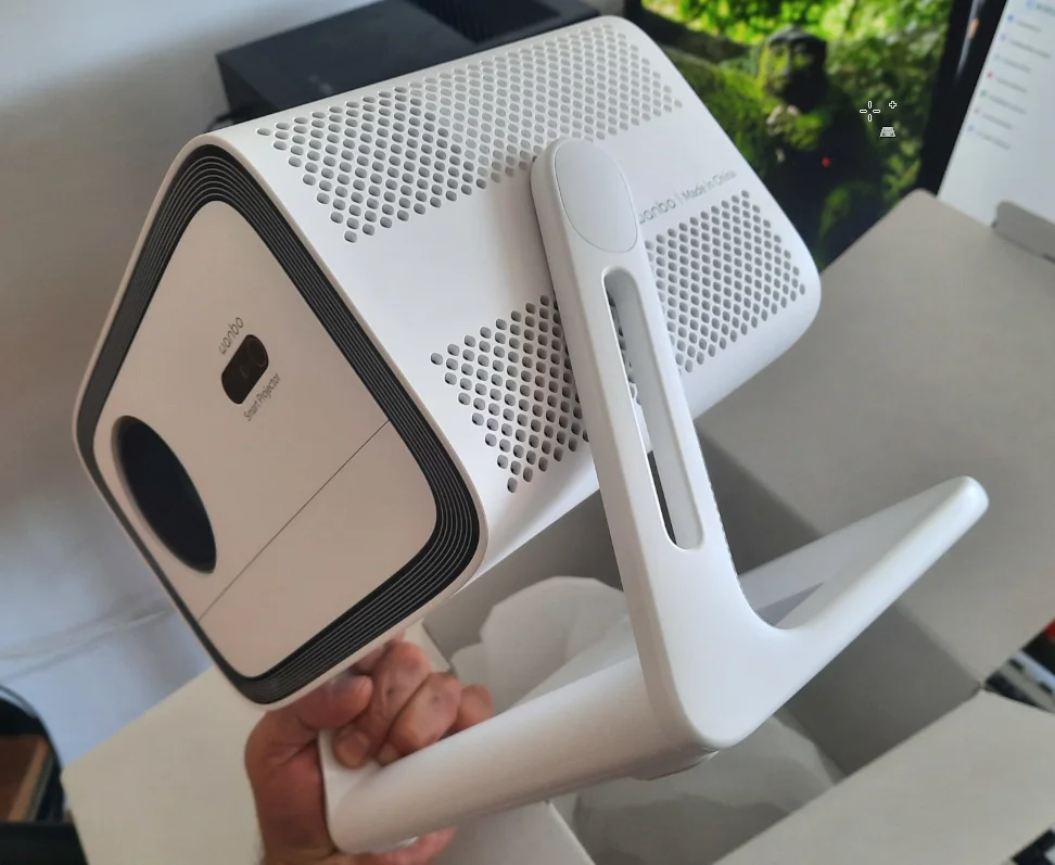 La taille du Wanbo Vali 1 est de 25,4×18,8 ×22,7 centimètres, son poids est de 2,8 kilogrammes. Sur la base de ces données, il convient au montage sur bureau, sur pied ou au plafond. Dans le cas de ce dernier, le manchon fileté intégré à la structure du pied Le projecteur peut être fixé grâce à lui, ce qui permet de varier la direction et la nature de la projection. Par exemple, si plusieurs murs ou surfaces sont adaptés à la projection (cela peut même être le plafond) et que vous trouvez un point de projection commun pour différentes directions, vous pouvez alors simplement le faire pivoter ou l'incliner sans le remonter.