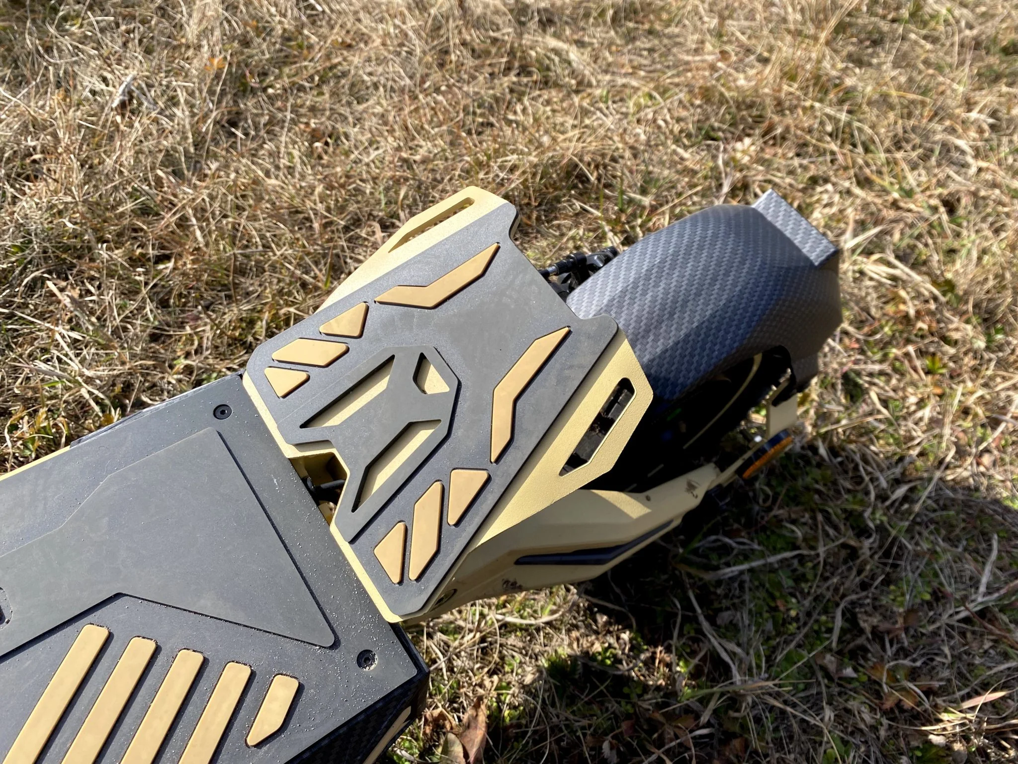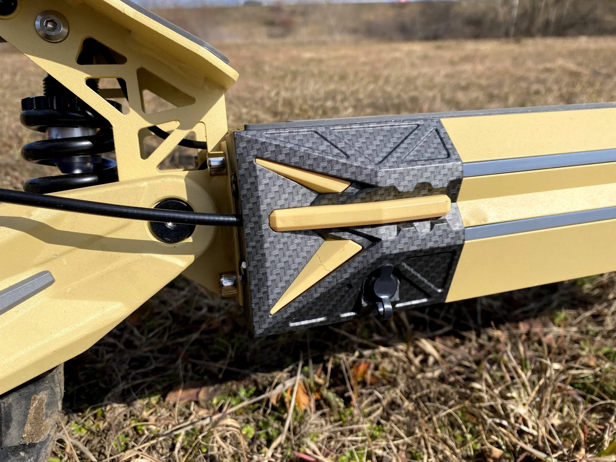La combinaison de couleurs jaune citron pâle et gris est déjà intéressante, mais elle est beaucoup plus excitante que si elle était simplement noire, « gâchée » par quelques éléments rouges ou gris. Chaque détail du scooter est magnifique, à certains endroits modèle d'effet carbone reçu, mais seulement avec goût, et à certains endroits le fabricant logo mignon est également apparue : une petite baleine rayée noire et jaune qui veut en fait être une abeille. À première vue, l’effet global du G2 Pro est comme si la plupart de ses éléments Avec une imprimante 3D aurait été préparé, mais bien sûr ce n’est pas le cas.