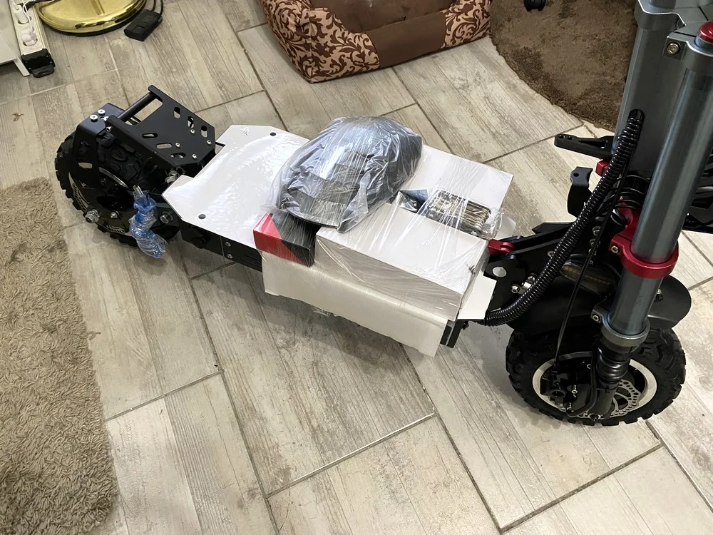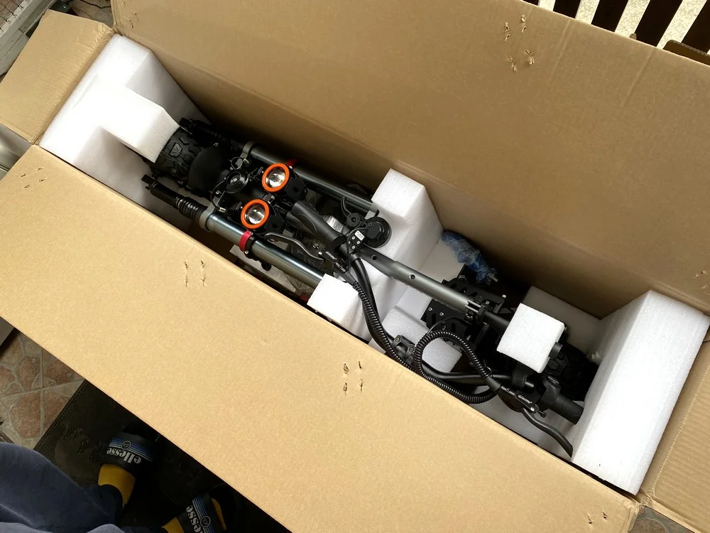 Les aventures de l'ANGWATT T1 commencent lorsque même le sortir de la boîte est une opération à deux, comme c'est le cas 49 kilogrammes il faut le sortir de l'emballage épais. Je pense dire Je n'ai même pas besoin d'écrire qu'avec autant de poids, ce n'est pas le genre de scooter électrique avec lequel on peut monter les escaliers en courant, mais tant que vous le traînez dans le garage, vous brûlerez quand même quelques calories. Évidemment pliant, mais nous préférons en rester là, car cela n'a presque aucun sens avec un monstre de cette taille, à moins de conduire un break ou un wagon couvert. L'histoire ne s'arrête pas lorsque l'on installe le volant, l'écran plus grand, le garde-boue, les index et l'antipatinage du volant. Vous devez mettre en place une pile, ce qui prend encore 1,5 à 2 heures par jour en serrant les vis ensemble, mais ce dernier est très important. Un outil à poignée unique est inclus, dans lequel vous trouverez tout ce dont vous avez besoin, des clés à douille aux clés allen et trois types de jeux.