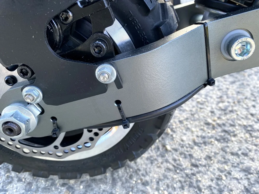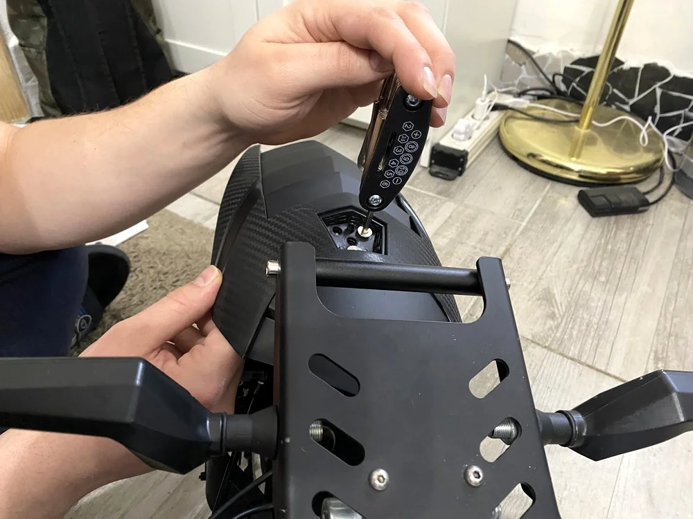 Il doit être boulonné sous le rehausseur du repose-pieds arrière, il est donc conçu à un très mauvais endroit. C'est un choix facultatif, mais j'aurais pensé que ce ne serait pas bien ainsi. Vous avez absolument besoin de ce support, je pense que personne n'a besoin d'expliquer pourquoi. Je n'ai pas non plus aimé le fait que les câbles près de la roue arrière du scooter soient fixés avec des attaches rapides, qui sont rapidement rongées par les dents de fer du temps.