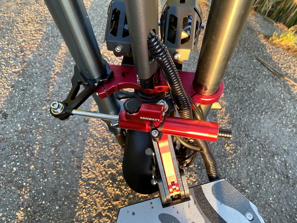 Le tamisage consiste à déplacer un centre de gravité, cela peut aussi être causé par une accélération brutale ou encore une petite panne de route. Lors de l'équipement doit être positionné complètement au centre, afin que le gouvernement puisse tourner également dans les deux sens. LE dureté vous pouvez le configurer avec le petit cadran dessus. Un réglage légèrement plus dur est recommandé pour un trafic à vitesse plus élevée, un réglage plus doux pour un trafic plus lent, mais j'ai essayé de trouver le juste milieu. Un à l'arrière jambe de force centrale à tension réglable fonctionne, qui doit être calibré en fonction de votre propre poids, car le véhicule il peut supporter jusqu'à 200 kilogrammes. Deux devant amortisseur hydraulique reçu et un double télescope. Avec tout ça Sur roues de 11 pouces il roule sur de sérieux pneus tout-terrain, il s'attaque donc aux terrains sablonneux/boueux/graveleux avec une facilité ludique.