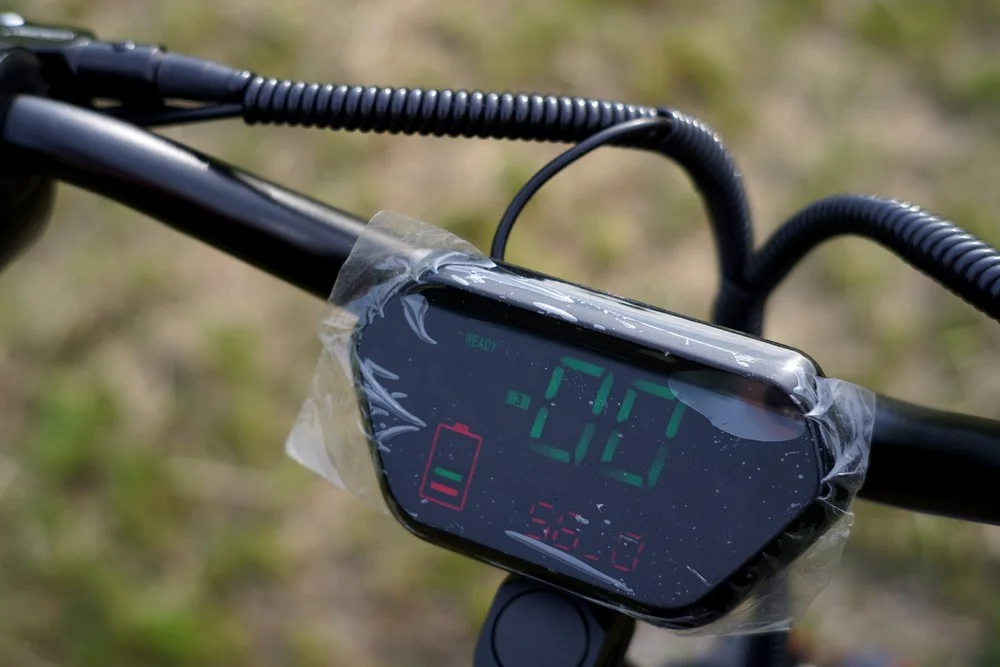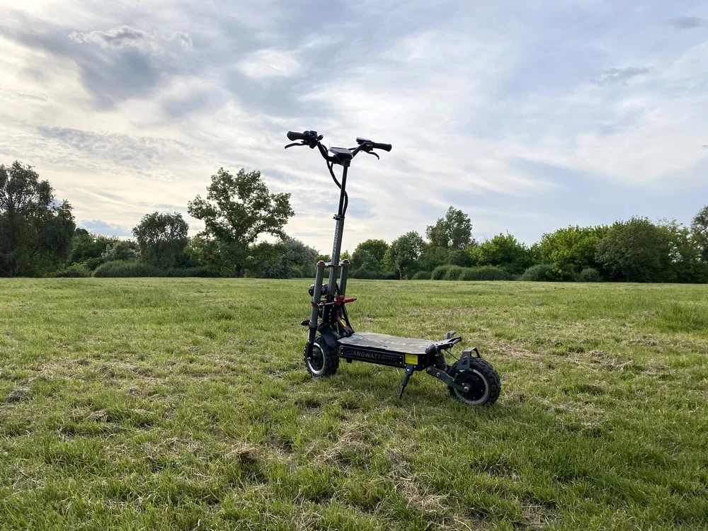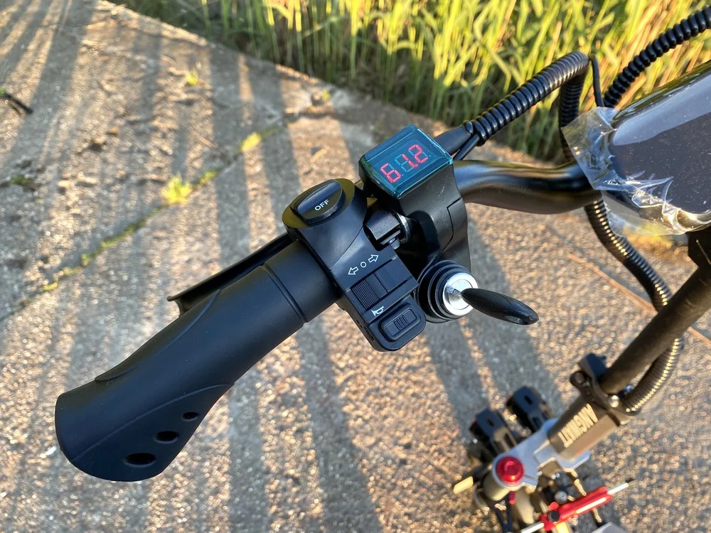 A l'ordinateur de bord ne triche pas beaucoup, cependant, ce n’est toujours pas autant que ce que le fabricant a écrit. D'ailleurs, si on parle d'ordinateur, je tiens à préciser qu'il y en a pas mal sur ce scooter, par exemple le grand écran au milieu est totalement inutile. Ici, vous pouvez voir les éléments habituels : la vitesse actuelle, le rapport, la distance parcourue, le niveau de la batterie, etc. Sur le côté gauche vous trouverez le contact, l'index et l'interrupteur d'éclairage, le klaxon et un affichage de la tension, et le levier de frein arrière. Sur le côté droit se trouvent le levier de frein avant et un levier d'accélérateur si petit qu'il était confortable de le tirer avec un seul doigt. Il y en a un ici aussi petit écran à partir duquel vous pouvez accéder au menu caché et à de nombreuses fonctions pratiques, comme le régulateur de vitesse, que je ne recommande pas d'activer à une vitesse aussi élevée, car même un conducteur de scooter régulier peut l'oublier. À côté du mini moniteur se trouvent le bouton d'alimentation et le bouton de sélection de mode, vous pouvez basculer entre un moteur simple et double avec l'interrupteur rouge. Les 2ème et 3ème vitesses du mode à deux moteurs sont presque égales à la mort, même les roues grattent à la moindre accélération, vous pouvez bien dériver avec lors du freinage. Si tout cela ne suffisait pas, vous pouvez rendre l'accélérateur encore plus agressif avec le bouton jaune. J'en donne cinq à la suspension, ainsi qu'au frein hydraulique, mais d'après ce que dit János Roll-Base, il faut aussi y prêter attention, car du liquide peut en sortir à tout moment.