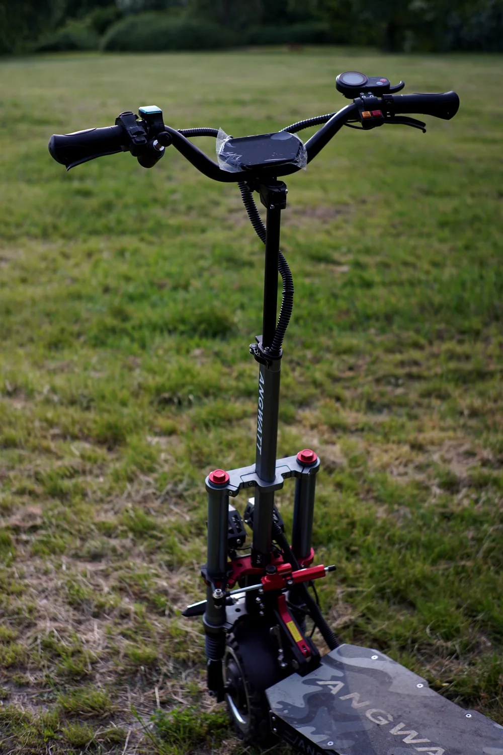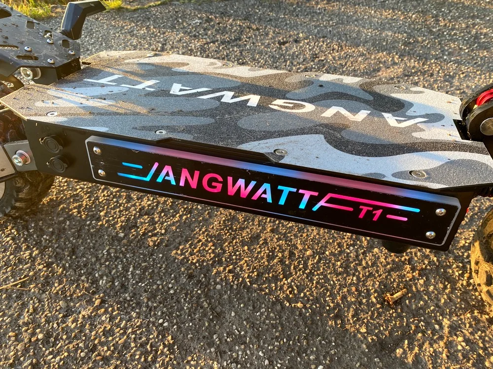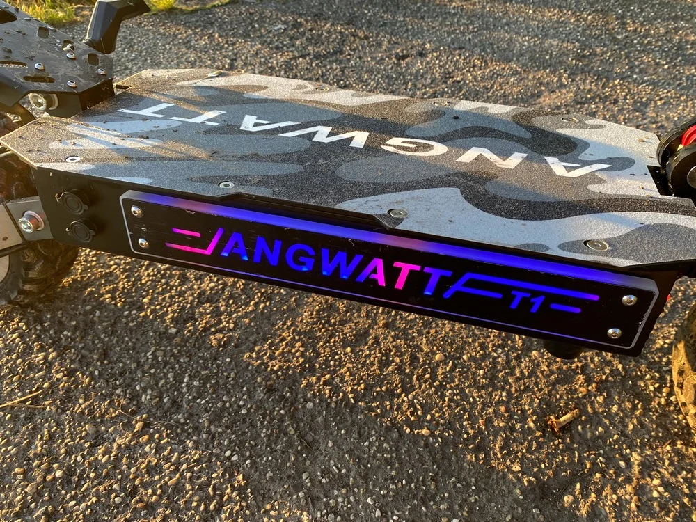 Les petits feux rouges à l'avant pourraient être plus blancs, mais l'inscription brutalement grande ANGWATT T1 sur le côté est un Miracle LED RVB, de plus, il peut être varié avec une télécommande. Les phares avant sont énormes, et les index sont légers, ce qui est plutôt cool et le klaxon est aussi fort qu'un klaxon de voiture. Ceux-ci vous aideront à vous faire remarquer le plus rapidement possible dans la circulation et je suis convaincu que vous pourrez facilement y laisser quelques pots. C'est si gros force et couple ce scooter est non seulement capable de se maintenir entre les voitures, mais