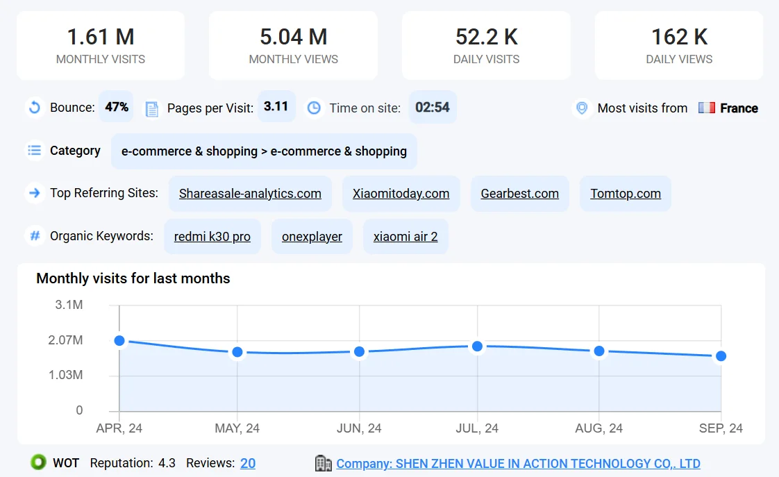 Oui, c’est particulièrement important parmi les sites chinois. Ceci est également confirmé par nos expériences personnelles, ainsi que par Trustpilot, où le nombre d'avis, la répartition et la raison pour laquelle quelqu'un a donné 5 ou 1 étoile valent la peine d'être examinés. La moyenne a attribué au site Web une note de 4,3 étoiles sur la base de 15 674 avis, dont 73 % étaient des notes de 5 étoiles.