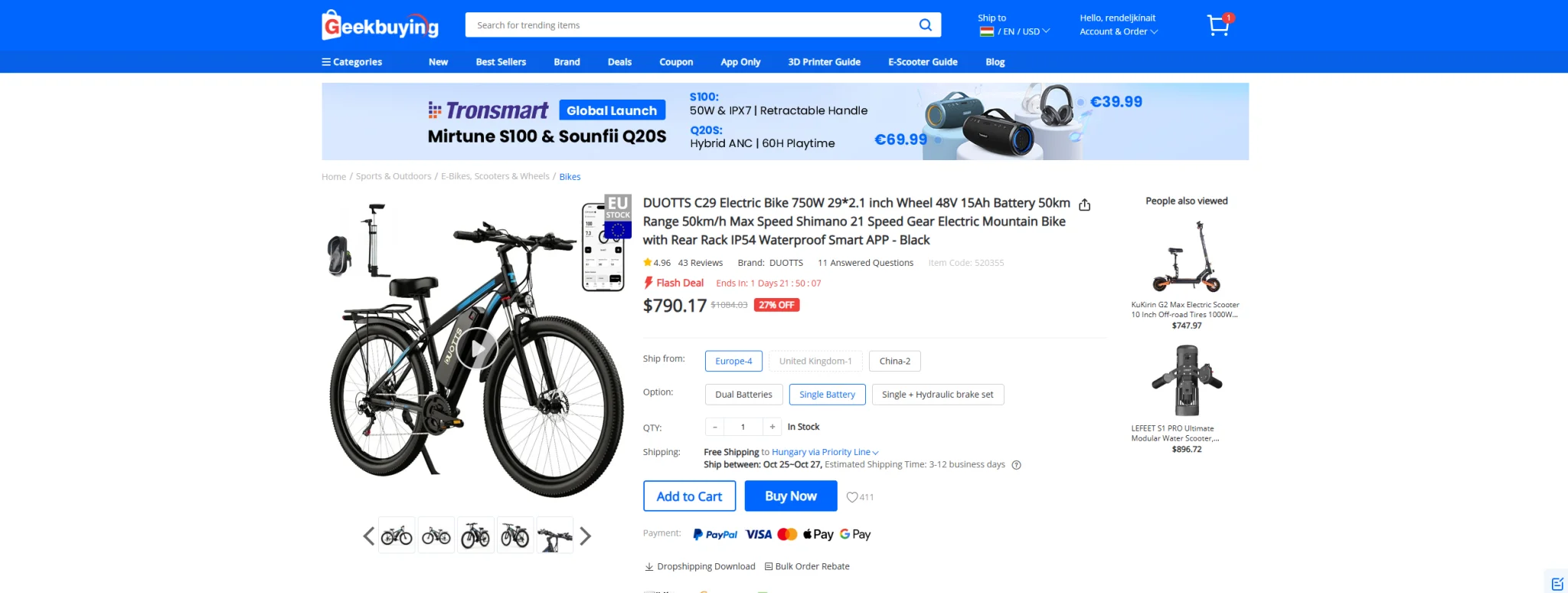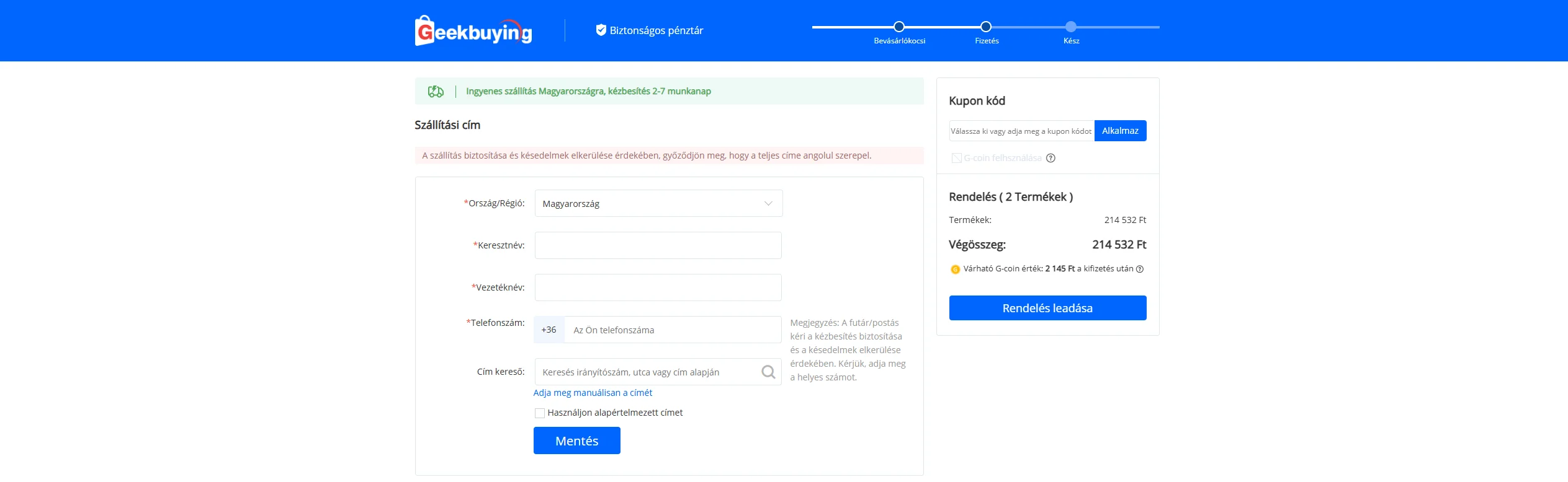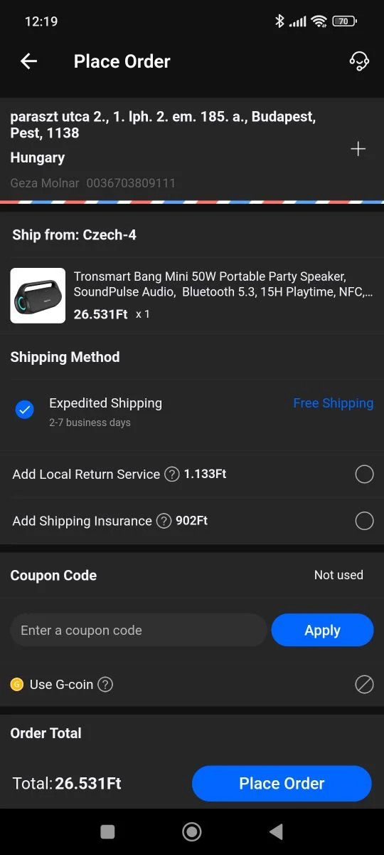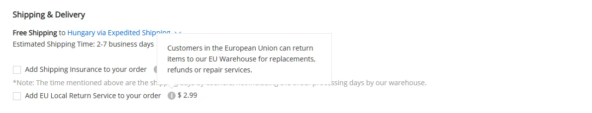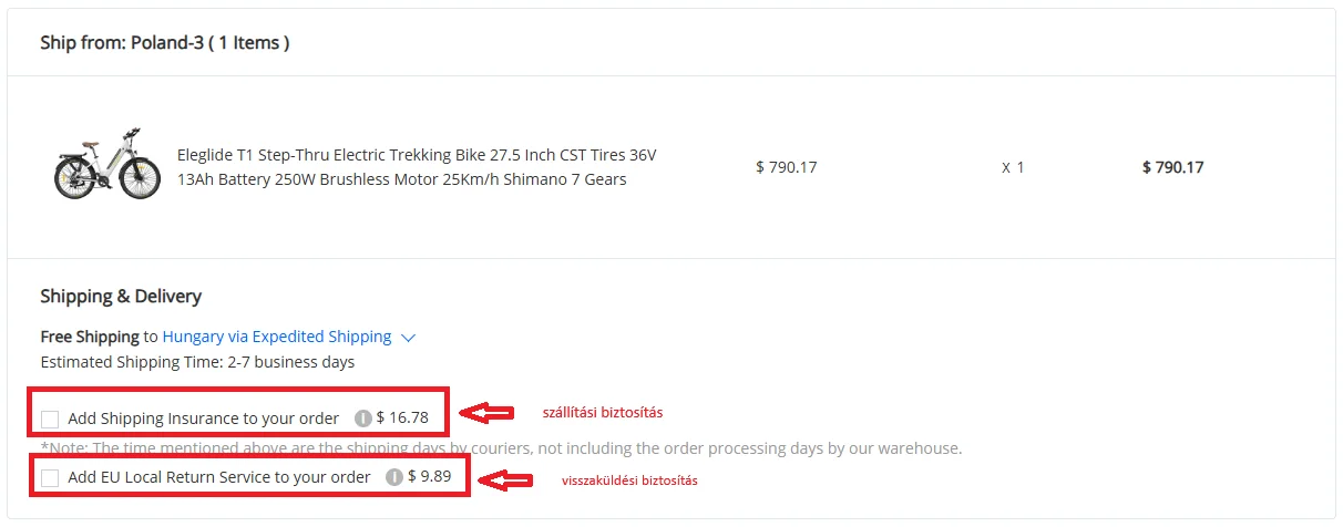Chez Geekbuying, pas seulement les frais d'expédition, mais en plus service de retour - Service de retour local de l'UE - peut également être demandé, mais pas pour tous les appareils. Le service est généralement disponible pour les produits dont le retour serait autrement problématique. Il s’agit généralement d’objets volumineux et lourds tels que des scooters électriques et des vélos. Dans ce cas, vous devez déterminer si les prestataires de services hongrois proposent la même chose à un prix inférieur ou supérieur aux frais de service de Geekbuying, puis vous devez faire un tour avec une deuxième entreprise de messagerie afin de régler le problème.