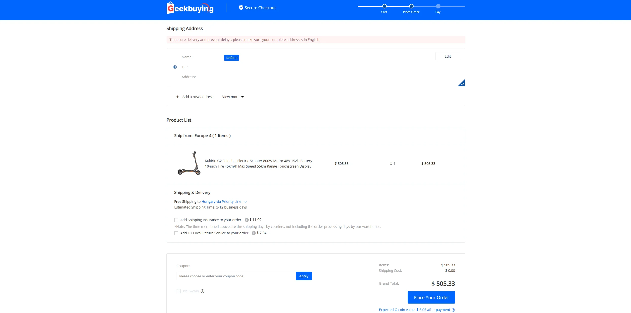 L'assurance expédition est un service qui offre une protection contre les dommages causés aux produits pendant le transport. Geekbuying ne compensera ces dommages que si Je souscris une assurance transport, mais contrairement à Banggood par exemple, cette option n'est pas cochée automatiquement par le système, mais vous devez la sélectionner. Dans notre expérience la plupart des appareils sont protégés par un double emballage, ils sont donc moins vulnérables, et PayPal fournit souvent de l'aide dans ces cas également, mais leur précédent service de remboursement des frais de retour a cessé, donc l'assurance d'expédition n'est pas du tout une option.