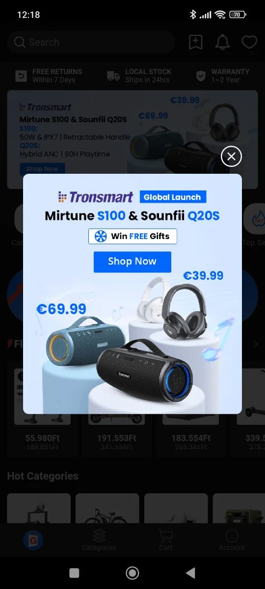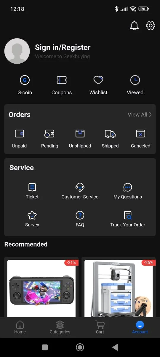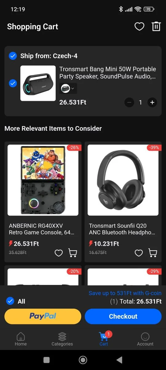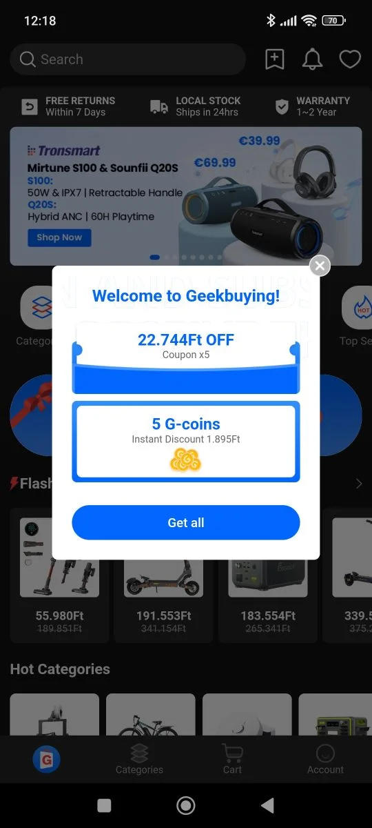 A Geekbuying a sa propre application téléphonique, que vous devez télécharger si vous souhaitez faire des choses sur votre mobile. Presque toutes les boutiques en ligne chinoises récompensent l’utilisation de leur application d’une manière ou d’une autre, mais l’interface de l’application ne diffère pas tellement de celle du site Web. Il n'y a qu'une seule chose que vous pouvez utiliser : l'application se concentre sur la région où vous vous trouvez, c'est-à-dire qu'elle convertit par défaut ma devise en HUF. Nous avons déjà beaucoup écrit sur les raisons pour lesquelles cela constitue un problème, ou du moins sur la manière dont cela entraîne des coûts supplémentaires. Par conséquent, réinitialisez la devise de HUF en USD, ce que vous pouvez faire dans le menu compte/paramètres (petit engrenage en haut à droite), dans la ligne Devise.