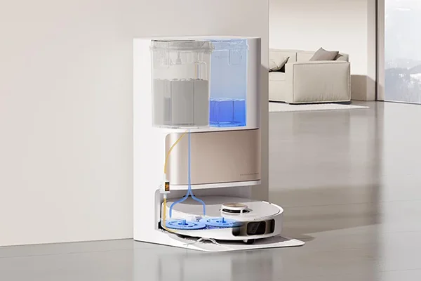 Le Xiaomi Dreame L10s Pro Ultra Heat contient l'essence de son nom : il peut non seulement laver grossièrement à l'aide de ses disques, mais il se sèche également, et peut même nettoyer à l'eau chaude. À notre connaissance, le Dreame L10s Pro Heat peut être connecté à un arrêt d'eau d'une manière unique, ce qui résolvait l'un des gros problèmes de l'automatisation : il fallait jusqu'à présent changer l'eau sale et l'eau propre.
