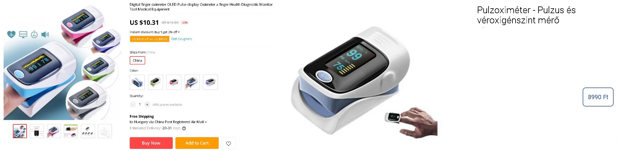 A vírusjárvány miatt folyamatosan belefutunk túlárazott véroxigénszint mérős Google hirdetésekbe, már ott is ez jön fel, ahol eddig értelmes tartalmat kaptunk. A cuccot a magyar boltok szépen felárazták a kínai kínálathoz képest, és nemcsak ezt a terméket láttuk már sokkal drágábban, hanem sok minden mást is, ez mostanában egy teljesen általános jelenség. Arra, hogy kikerüljük ezeket a vásárlási csapdákat van egy kiváló és nagyon egyszerű módszer, amit mindenkinek ajánlunk: használjátok az Aliexpress applikáció képalapú keresését, ami az összes hasonló terméket kilistázza, és ezek rendre sokkal olcsóbbak.