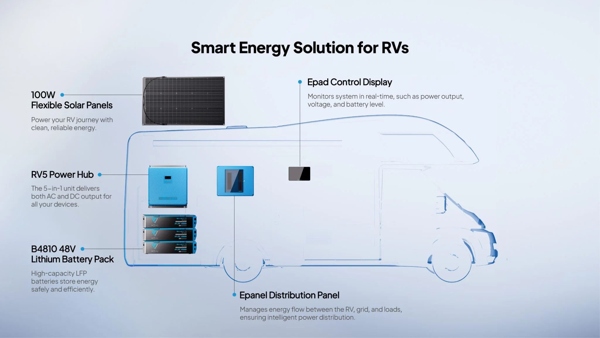 Az egyik legnagyobb dobás az új RVSolar 48 V-os rendszer, amely kifejezetten lakóautósoknak, hajótulajdonosoknak és off-grid életet választóknak készült. Ez egy 6 kW teljesítményű, AC + DC támogatással ellátott komplett energiarendszer, amely 30 perc alatt telepíthető, így akár barkácsolásban kevésbé jártas felhasználók is könnyedén üzembe helyezhetik. A moduláris felépítésnek köszönhetően mindössze öt fő komponensből áll, és nyitott rendszerként harmadik féltől származó akkumulátorokkal, napelemekkel vagy elosztókkal is kompatibilis.