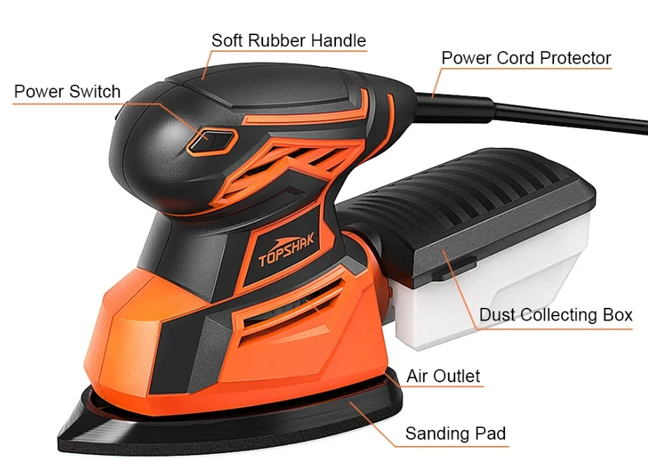 A Topshak TS-SD1 egy olyan deltacsiszoló, amivel éleket és sarkokat kifejezetten jól lehet lecsiszolni, nagyobb felületekre viszont már jobb egy gyalugépet használni. 13 500-at fordul a motorja percenként, aminek 130 watt a teljesítménye. Használható fémre, fára és műanyagokra is, és természetesen különböző csiszolópapírokat is rá lehet tenni. Alapból adnak hozzá 12 darab papírt, amiből 4 darab 80-as, 4 darab 120-as és szintén négy darab 180-as papír. Porgyűjtő tartállyal rendelkezik, tehát a finom forgácsot egy kis dobozkába fújja, amit aztán kiönthetünk a szemetesbe.