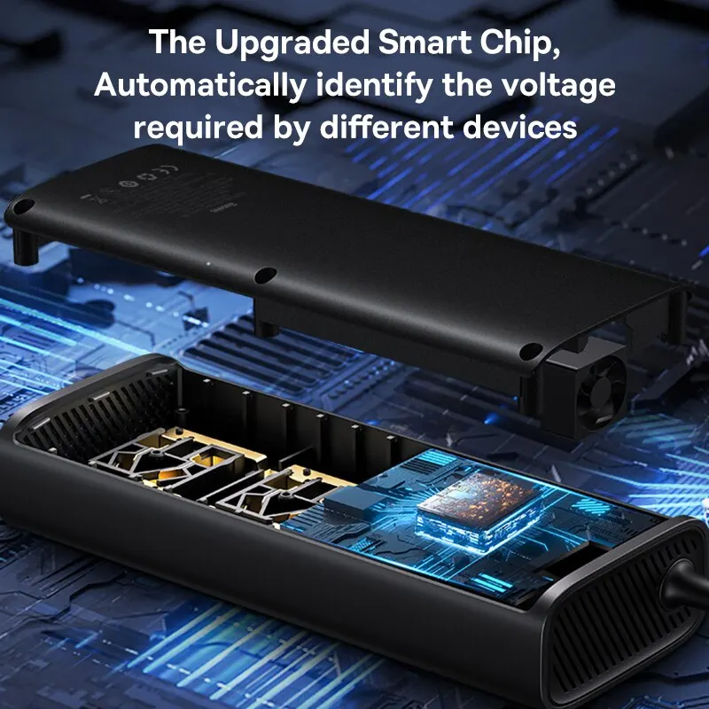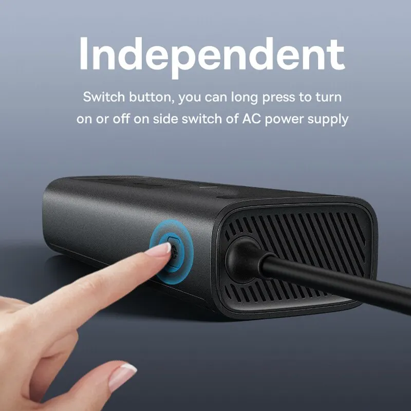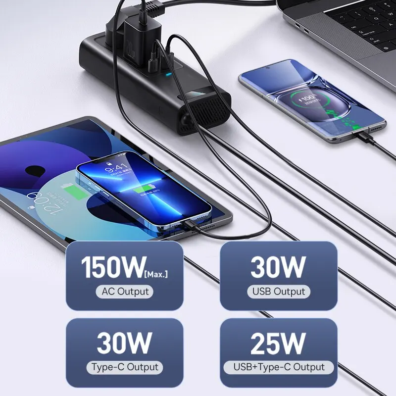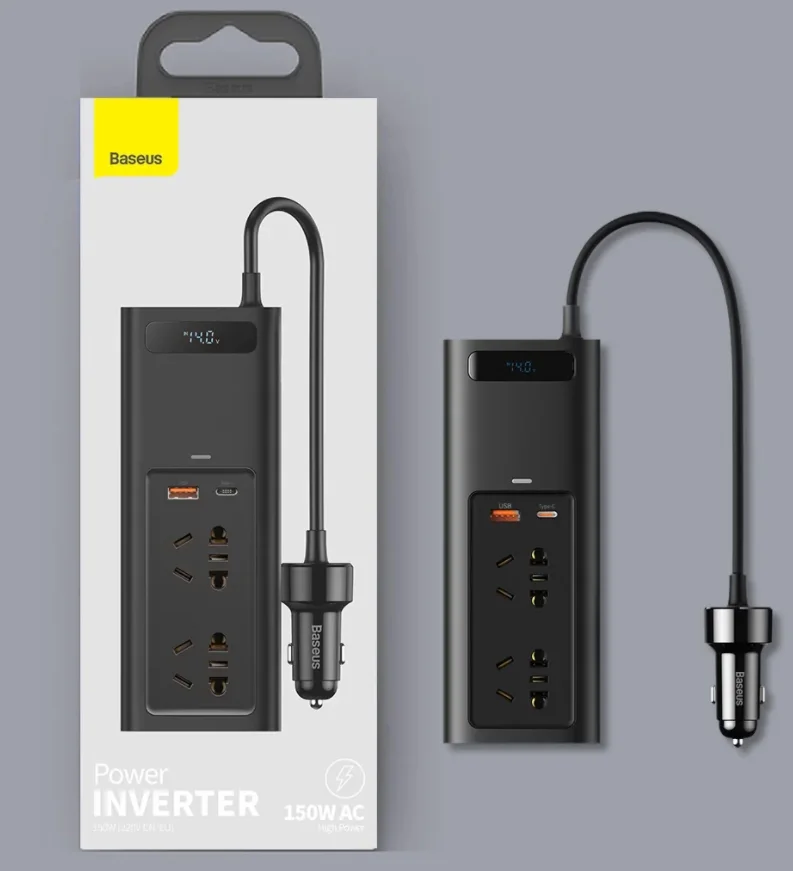 A Baseus áramátalakítója bármilyen személyautóba passzol, amelyben van 12V-os akkumulátor. A szivargyújtóba kell csatlakoztatni, és az onnan nyert áramot invertálja át két váltóáramú dugaljra, amibe lehet európai, amerikai és kínai dugót is dugni. Ezeken kívül van rajta egy hagyományos USB-A port, valamint egy Type-C. Ezeken a csatlakozókon 30 wattot tud kitolni, míg a váltóáramú dugaszokon 150 wattot. Tehát mikrót, hősugárzót és ilyen nagyfogyasztású gépeket nem lehet rákötni, de kisebb fogyasztókkal elbír, mint például a laptopok, töltőadapterek, lámpák és ehhez hasonlók.