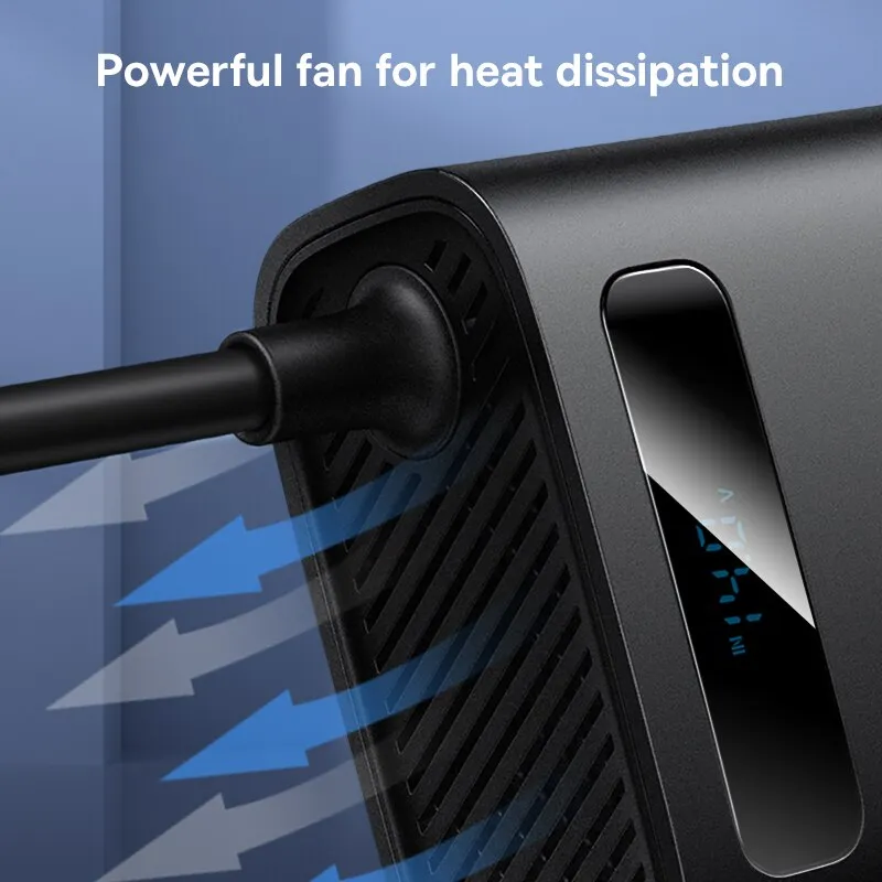 Található rajta egy kijelző, ahol mutatja az aktuális feszültségértéket. Az ilyen invertereknek szükségük van aktív hűtésre, ami ebben a Baseusban is van, de csak egy aprócska ventilátor személyében, ami elvileg nagyon halk.