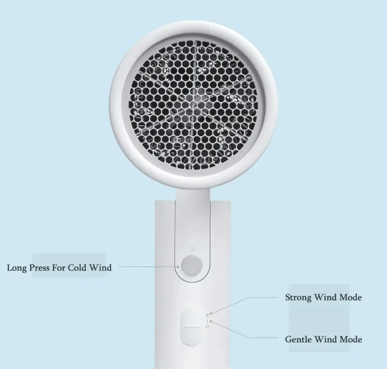 Kisméretű és össze is csukható a Xiaomi hajszárító, mely így rendkívül kis helyet foglal. A teljesítménye ehhez képest teljesen kielégítő, 1600 wattos, és két lépcsőben állíthatjuk a fújás erősségét is. Egy csúszka található rajta, amivel bekapcsolhatjuk és a fokozatok között válthatunk, illetve van egy különálló gomb, amit ha megnyomunk, akkor hideg levegőt fúj.