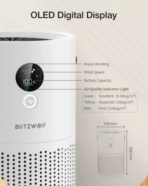 A BW-TAP1 a korábbi modellekkel ellentétben egy kisebb, hordozható készülék lett. A kütyü mindössze 1,25 kilogrammot nyom és a helyigénye sem nagy, hiszen mindössze 16x16x26,8 centis méretekkel rendelkezik, így a lakás bármely pontján könnyen elhelyezhetitek. A beépített 10 000 mAh-s akkumulátorának köszönhetően konnektor nélkül is használhatjátok akár 20 órán keresztül. Három erősségi fokozattal rendelkezik, maximális teljesítményen 60 köbméternyi levegőt képes óránként megtisztítani, a gyártó 20 négyzetméteres területre ajánlja.