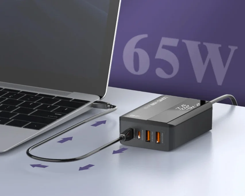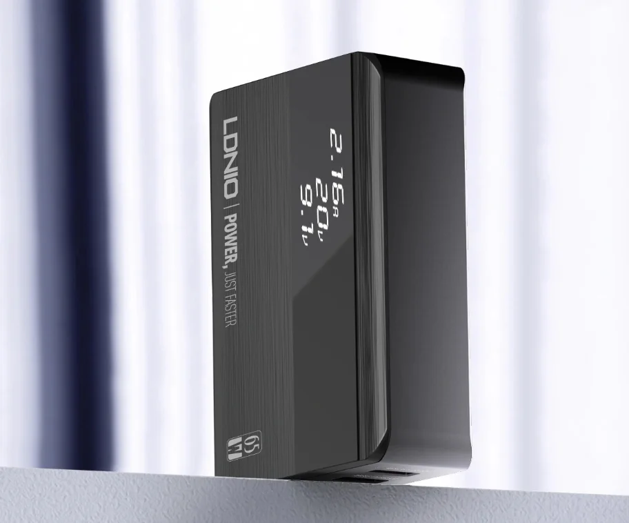 Négy porttal is felszerelték, van két hagyományos USB-A portja, és két darab Type-C. A maximálisan leadható teljesítmény 65 watt, viszont ezt akár egyetlen egy csatlakozón, az egyik Type-C-n is le tudja adni. Ide érdemes csatlakoztatni egy notebookot, ami ha PD képes, akkor fel tudja tölteni. A másik Type-C port max 20 wattot tud, az USB-A kimenetek pedig 20 és 30 wattosak. Természetesen támogat mindenféle gyorstöltést, például PD 3.0-t, QC 3.0-t, AFC-t, FCP-t és SCP-t. Nem elégszik meg ennyi tudással az eszköz, nagyon szimpatikus tulajdonsága, hogy került rá egy informatív kijelző is, ezen képes megmutatni az aktuális feszültség és áramerősség értékeket.