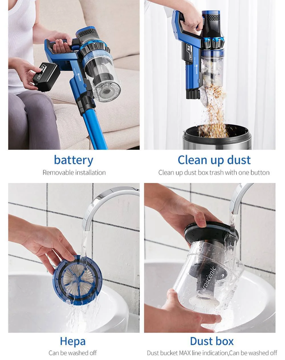 A dobozban találtok még 2 darab szűkítőfejet is, melyekkel a különböző felületeket, például polcokat tudtok tisztává varázsolni. A kiáramló levegőt HEPA filter szűri meg, ami még a legapróbb porszemeket is megköti. A szűrő egyébként vízzel mosható, és ez igaz a 0,65 literes portartályra is. A porszívó egy töltéssel akár 48 percen keresztül tud működni, maximális szívóereje pedig 22 000 pascalos.